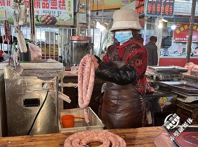 在农贸市场,一家加工店铺内老板娘正在腌制腊货,来这里加工腊味的顾客也是络绎不绝。每年临近春节,她家腊味制品总是供不应求,今年也不例外,她做的手工香肠尤受青睐。老板娘告诉记者,腊味从选材、配料、腌制直到晾晒风干,每一个步骤都不能有一丝马虎。