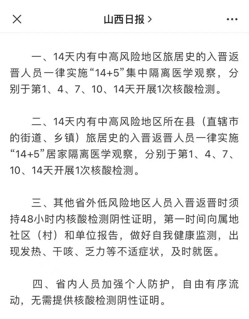 1月20日晚,山西省疫情防控办发布消息,省外低风险地区人员入晋返晋时须持48小时内核酸检测阴性证明,第一时间向属地社区(村)和单位报告,做好自我健康监测,出现发热、干咳、乏力等不适症状,及时就医。省内人员加强个人防护,自由有序流动,无需提供核酸检测阴性证明。