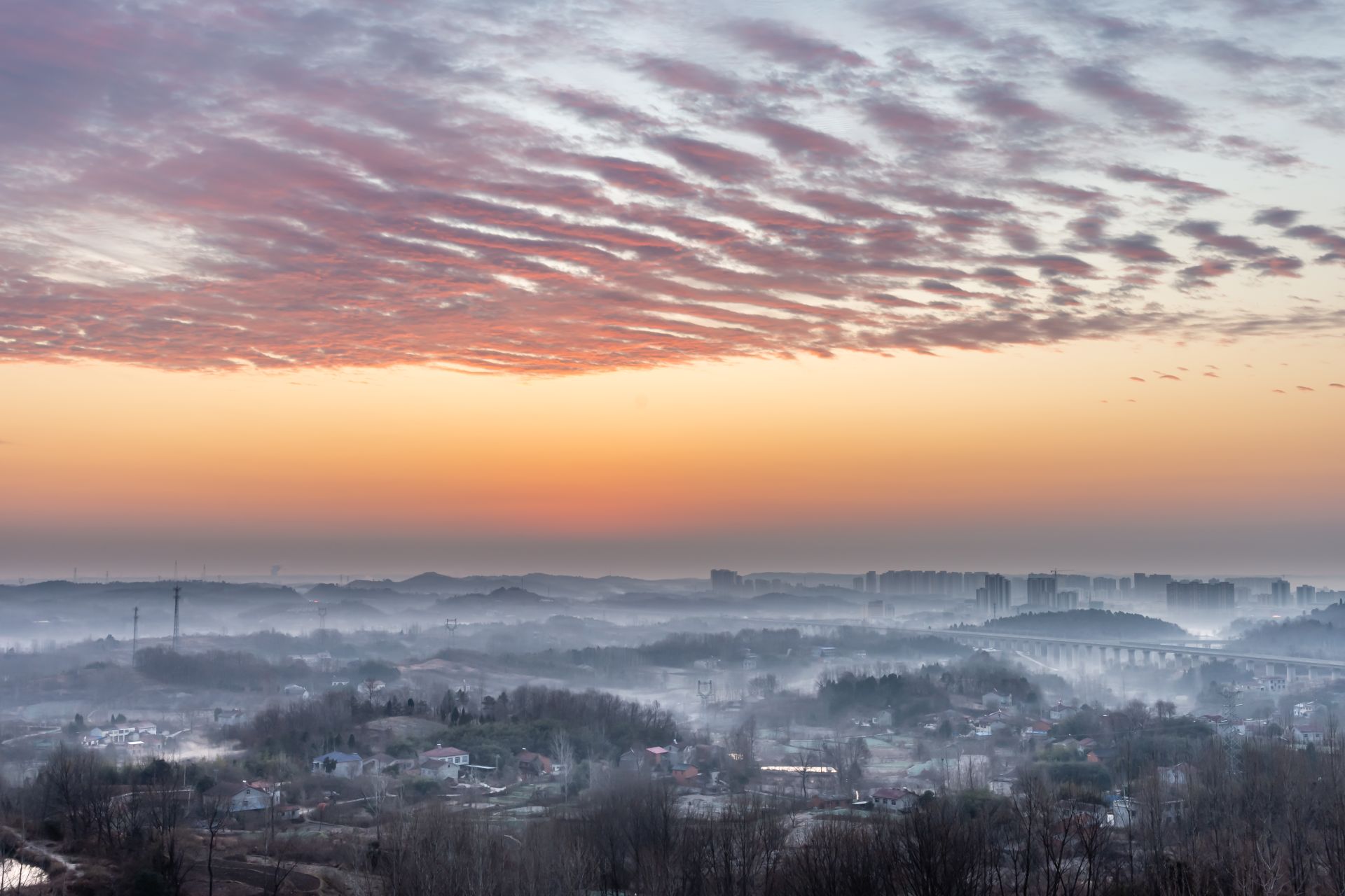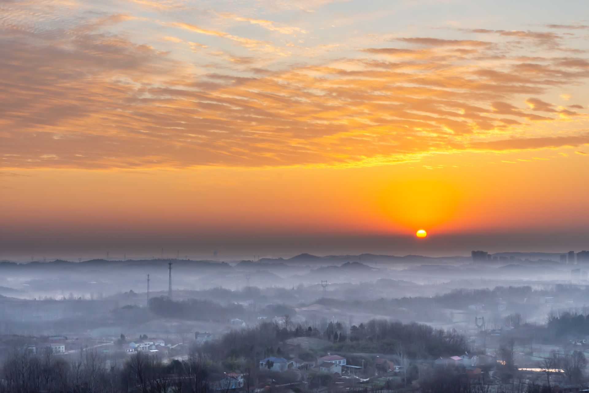 当太阳缓缓上升,金色晨光穿透薄薄的云层,倾洒在树梢屋檐上,整个村庄被笼罩在金色的光辉中,晨曦的光芒折射出美丽的颜色,这是属于冬天别样静逸的美。