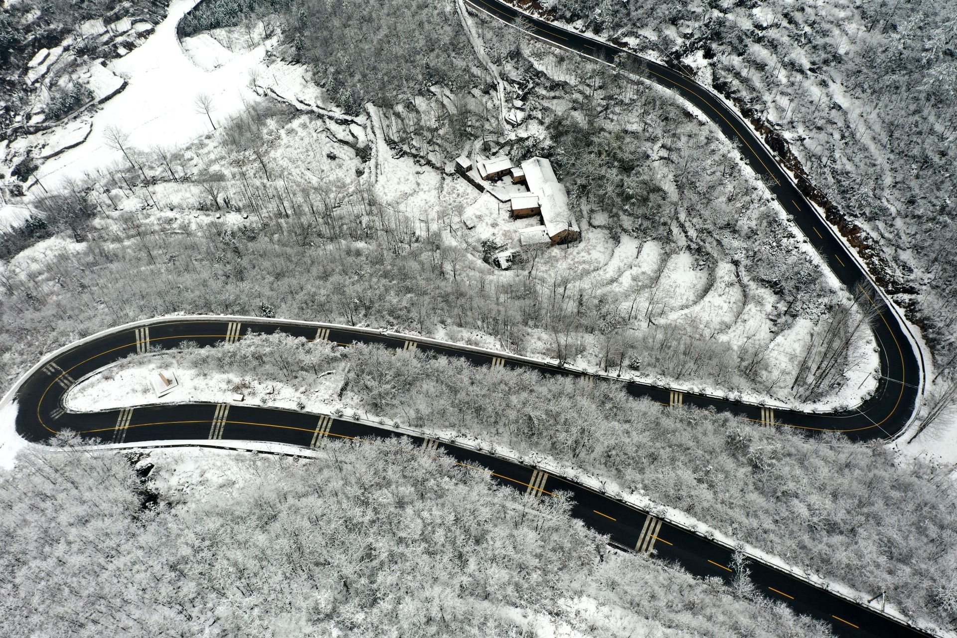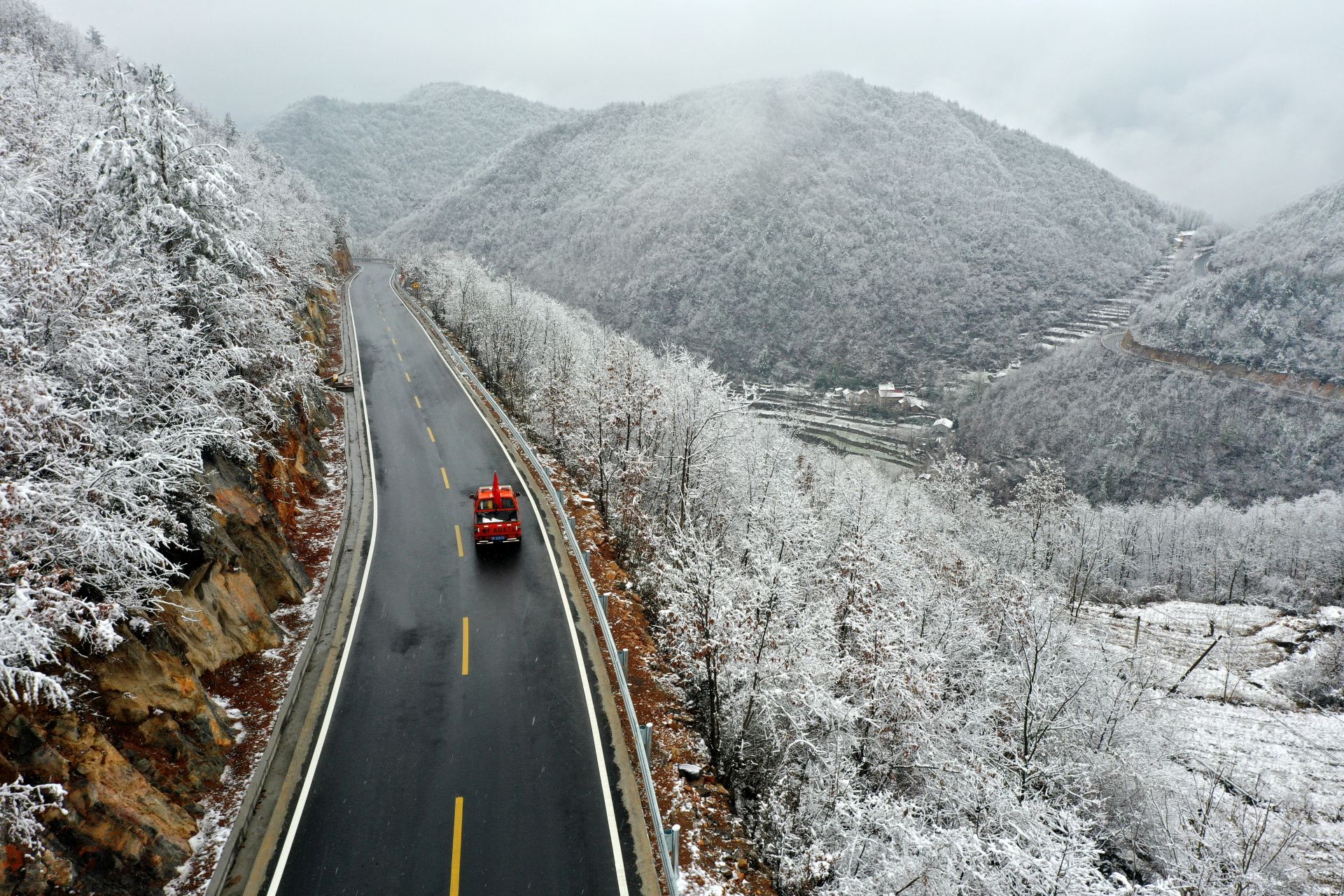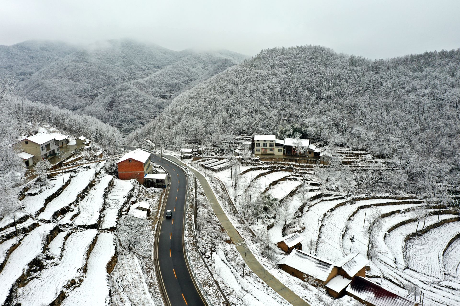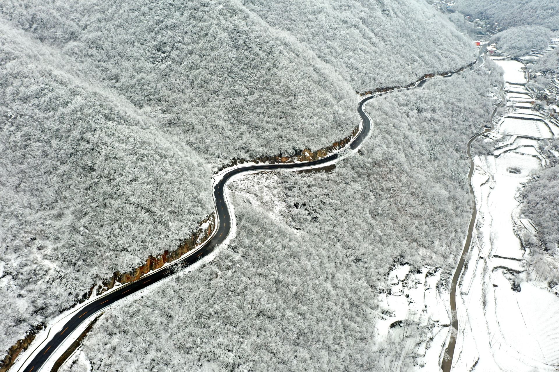 雪后的湖北省襄阳市南漳县薛坪镇银装素裹,蜿蜒的公路与村落、田园在白雪的映衬下形成一幅幅水墨丹青画卷,美不胜收。