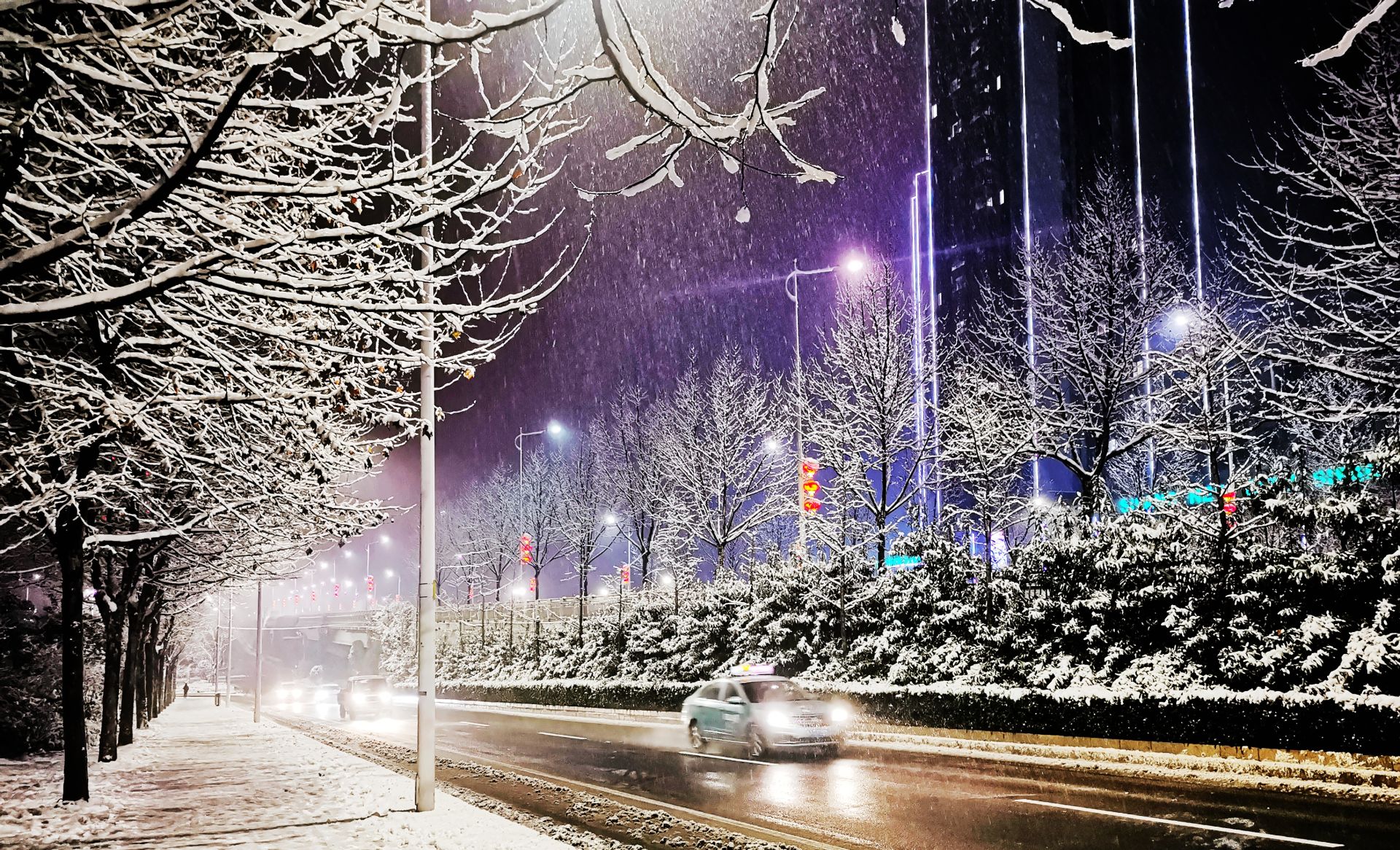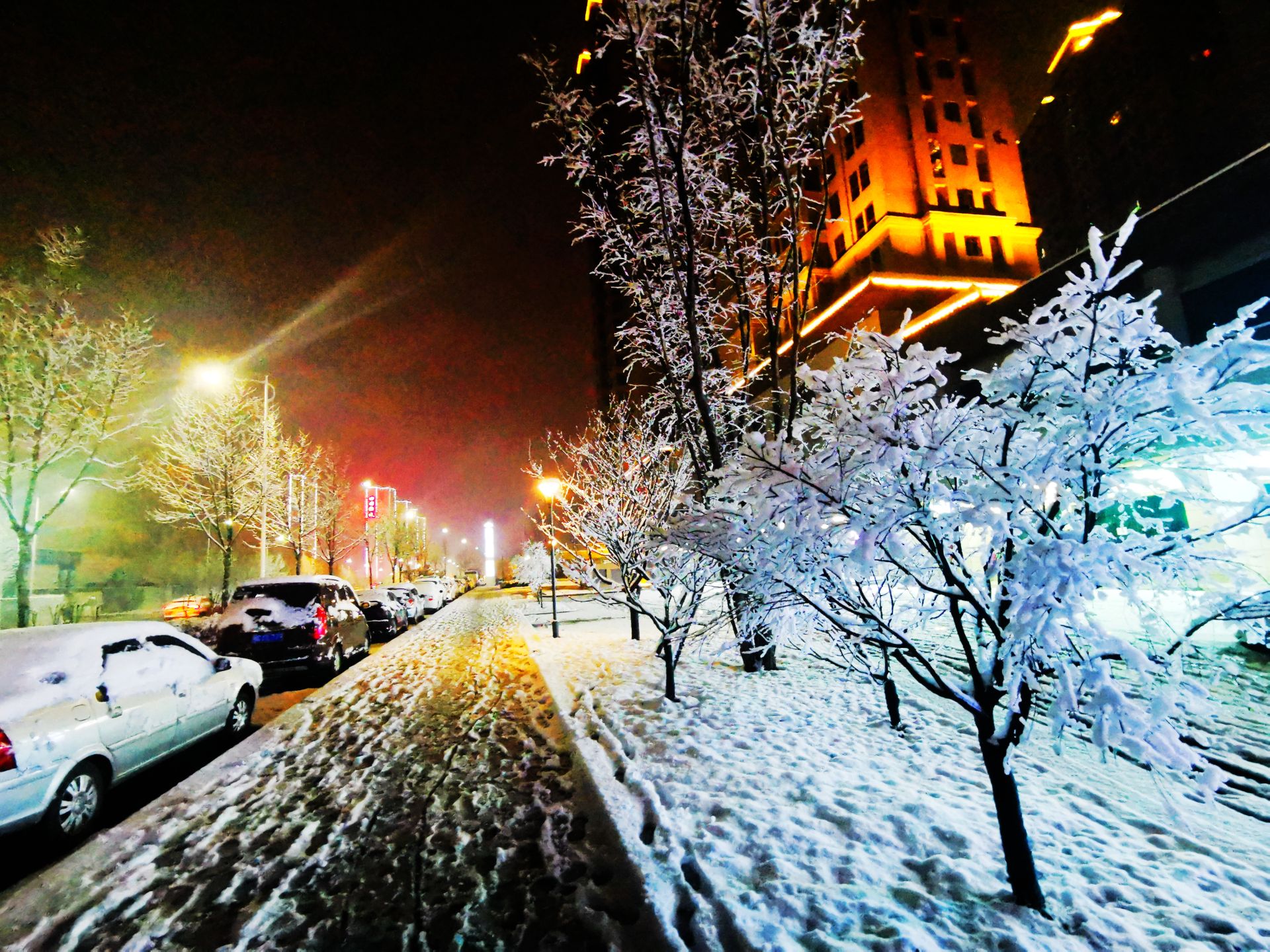 1月22日下午,一场大雪过后,十堰发展大道、文旅城一带的夜晚被美艳的雪景覆盖,仿佛绘画大师的调色板,处处呈现出“火树银花不夜天”,堪比仙境、无与伦比的斑斓色彩。