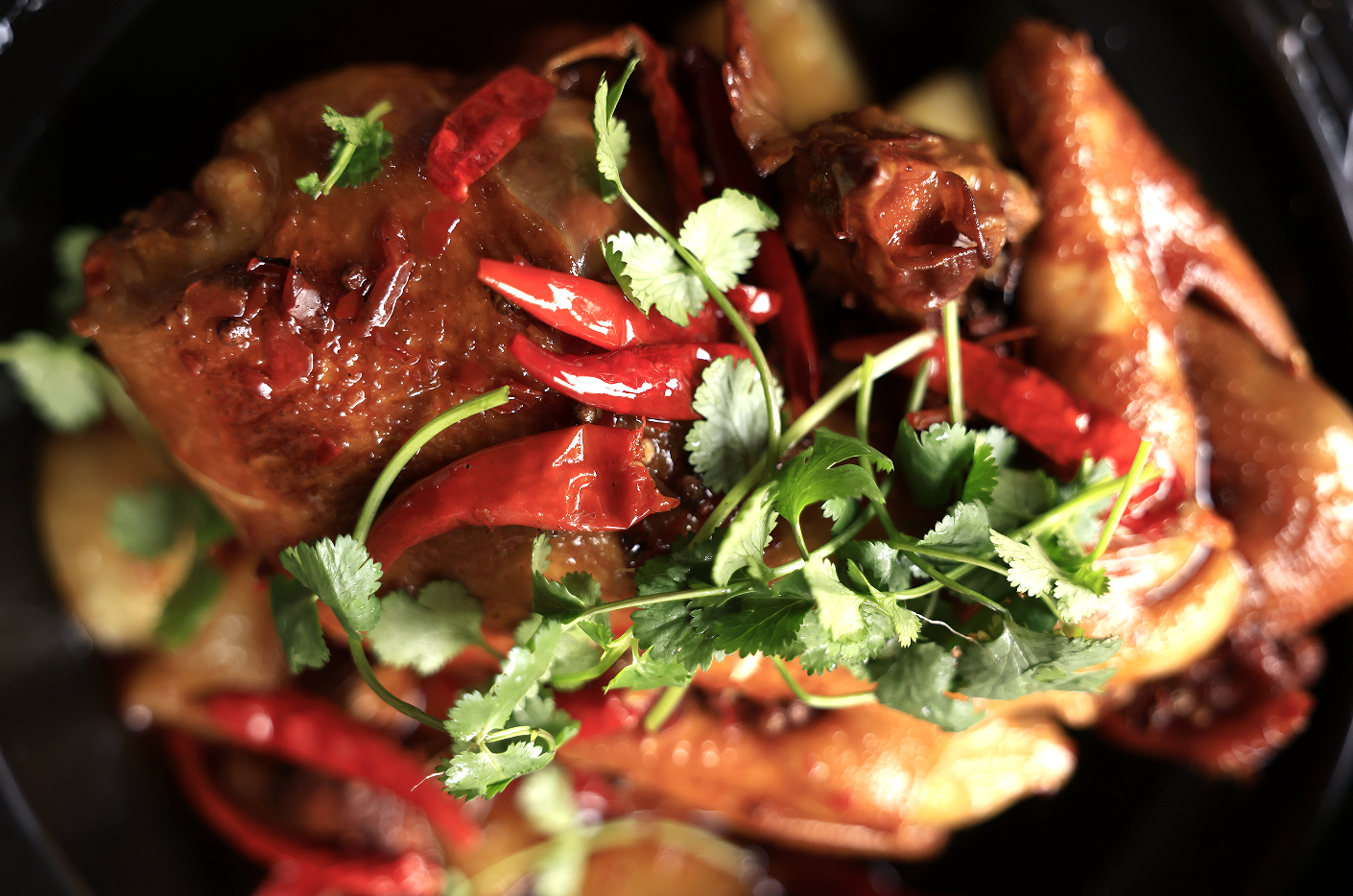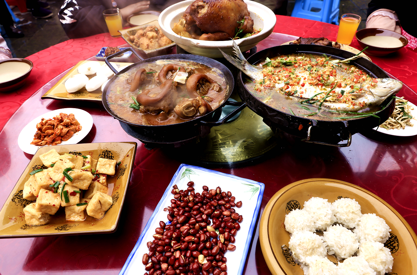 在大家齐心协力下,喜砂扣肉、蹄髈等土家八大碗土家特色菜、土家油茶汤等就热气腾腾的端上了桌。