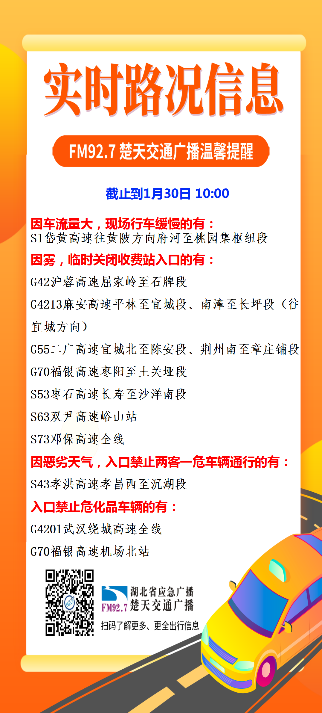 武汉中心气象台首席预报员 王珊珊:春节期间,主要关注大雾时段,大雾时段主要出现在1月30日、31日(除夕)早晨,此外,在2月4日(正月初四)-5日(正月初五)的早晨到上午时段,部分路段会出现大雾天气。雨雪天气时段需要关注2月1日(正月初一)晚上到3日(正月初三)白天,以及2月6日(正月初六)-7日(正月初七),全省大部将出现雨雪天气。公众出行需要防范道路湿滑、道路结冰对出行所带来的影响。