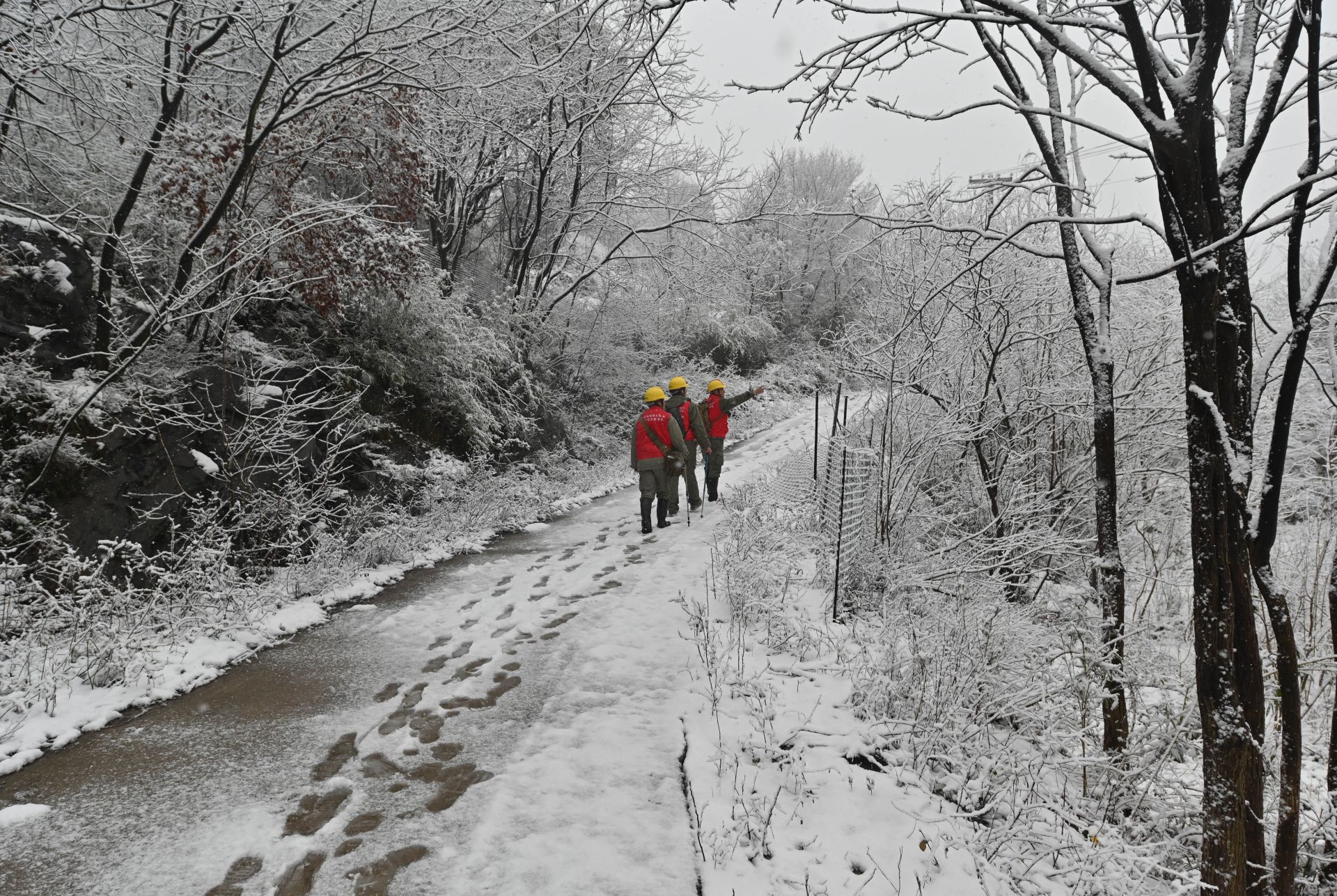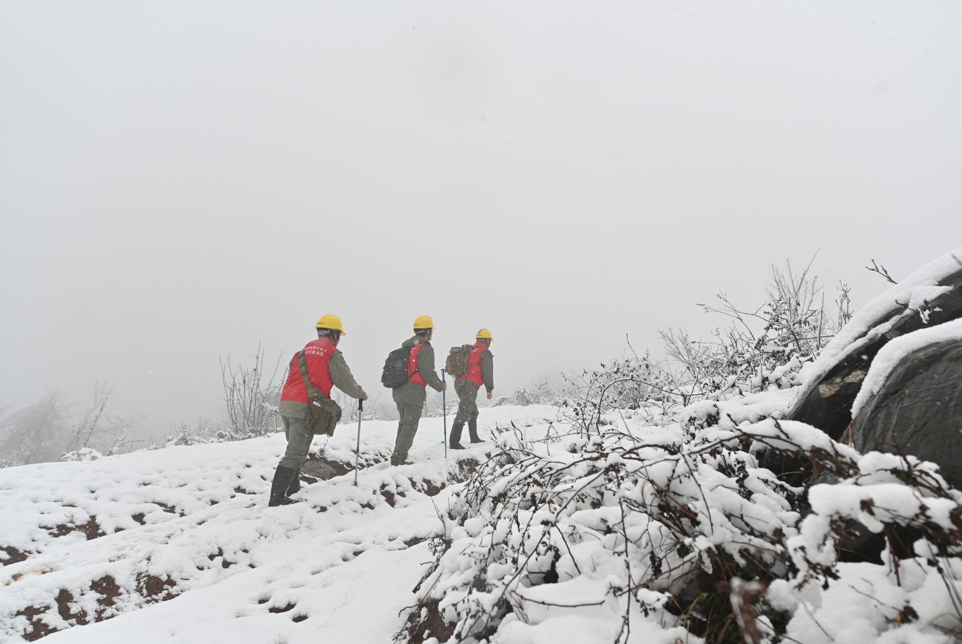 10点半,雪又下大了,他们帽檐挂满了冰溜。沿着原路下山,之前踩过的雪混合着黄泥让下坡路更加难行,三人互相搀扶,向下个铁塔的方向,翻山踏雪而去。