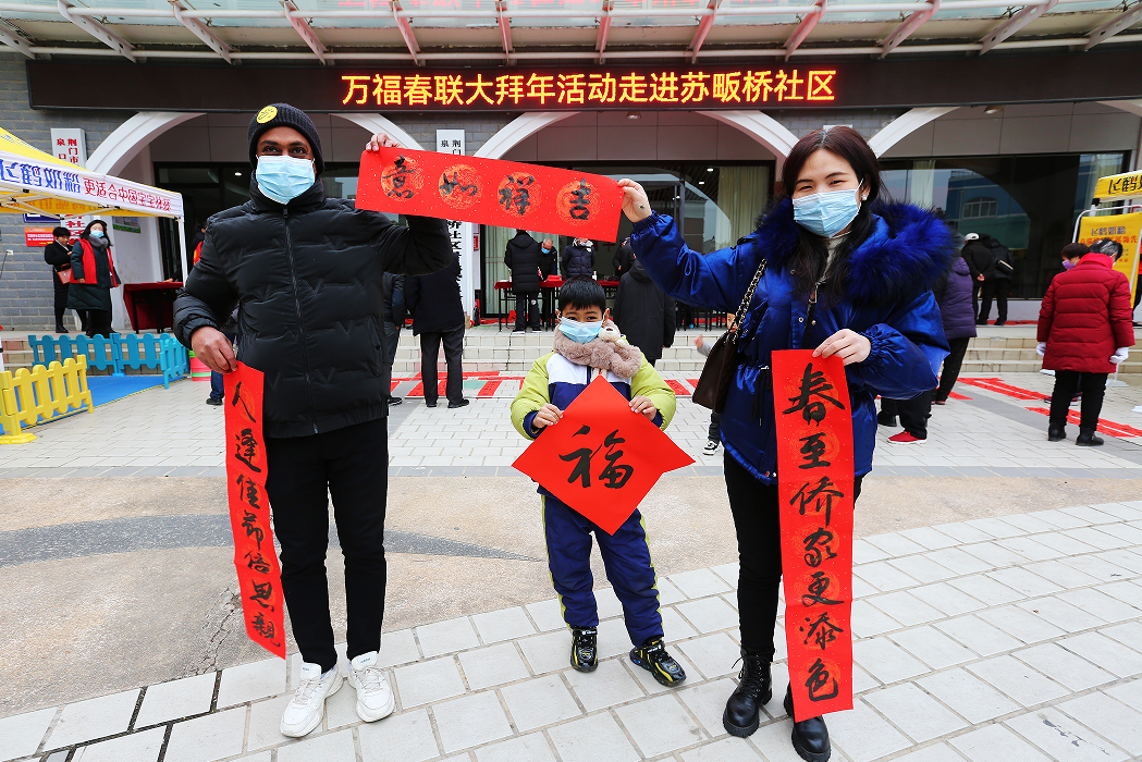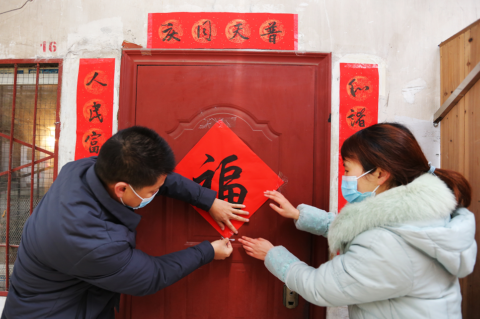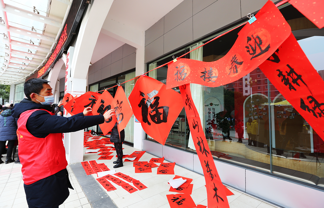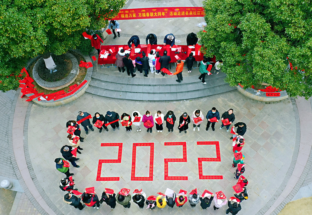 2022年1月19日,在湖北省荆门市掇刀区掇刀石街道名泉社区,居民、书法家和社区工作人员共同用春联摆出“2022”字样,迎接虎年春节的到来。当天,“文明盈门 福送万家 万福春联大拜年”活动在名泉社区举行,10余位书法家挥毫泼墨,将300余副春联和200多个福字、100多个廉字送给社区居民,祝福大家吉祥过节、清廉过节。,祝福大家吉祥过节、清廉过节。