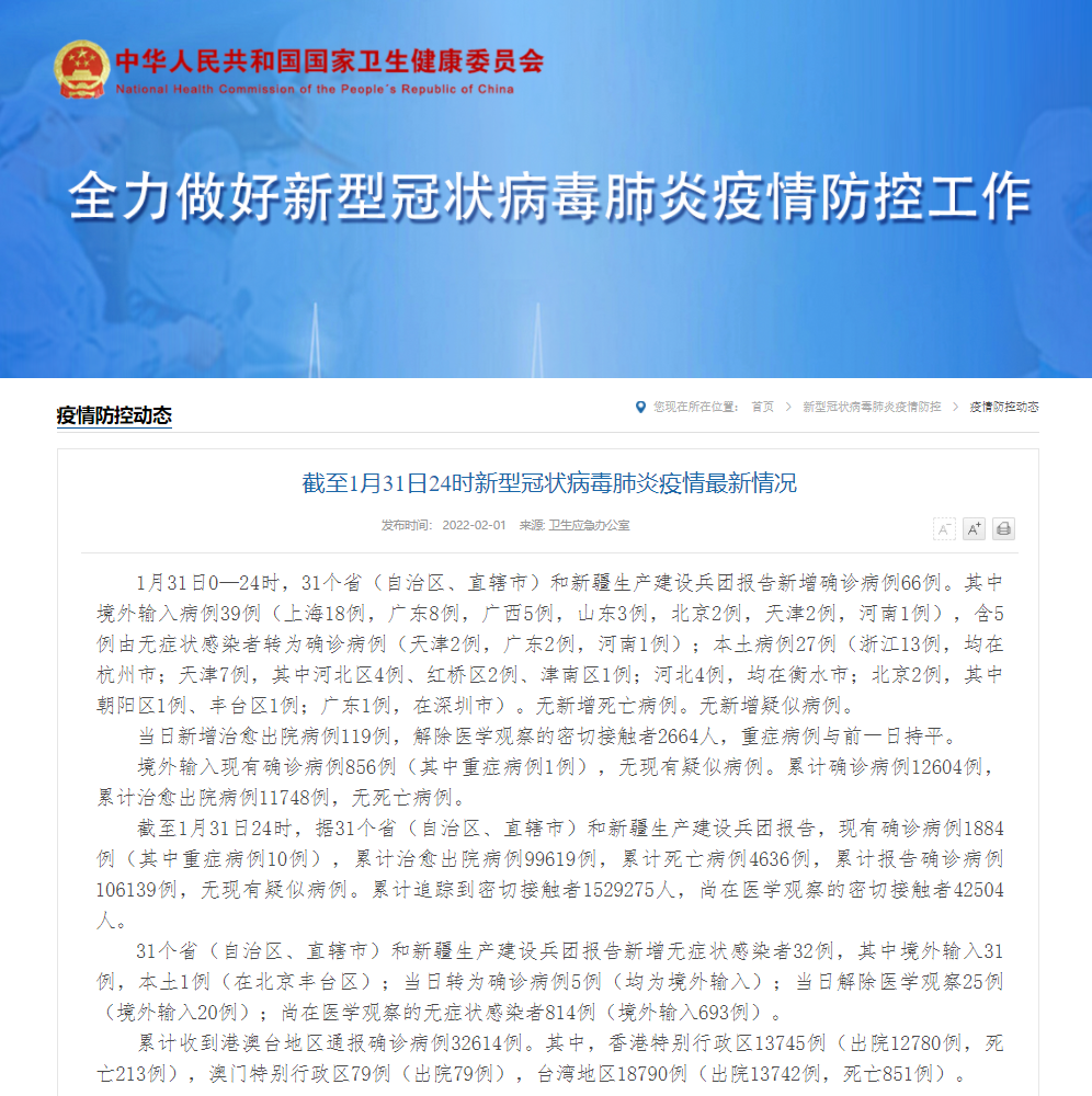 1月31日0—24时,31个省(自治区、直辖市)和新疆生产建设兵团报告新增确诊病例66例。其中境外输入病例39例(上海18例,广东8例,广西5例,山东3例,北京2例,天津2例,河南1例),含5例由无症状感染者转为确诊病例(天津2例,广东2例,河南1例);本土病例27例(浙江13例,均在杭州市;天津7例,其中河北区4例、红桥区2例、津南区1例;河北4例,均在衡水市;北京2例,其中朝阳区1例、丰台区1例;广东1例,在深圳市)。无新增死亡病例。无新增疑似病例。