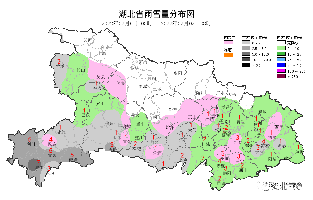 2日晚上(大年初二):鄂西南、江汉平原南部、鄂东北东部、鄂东南阴天有小雨雪;其他地区阴天,局部有小雨雪。高海拔地区有小到中雪。