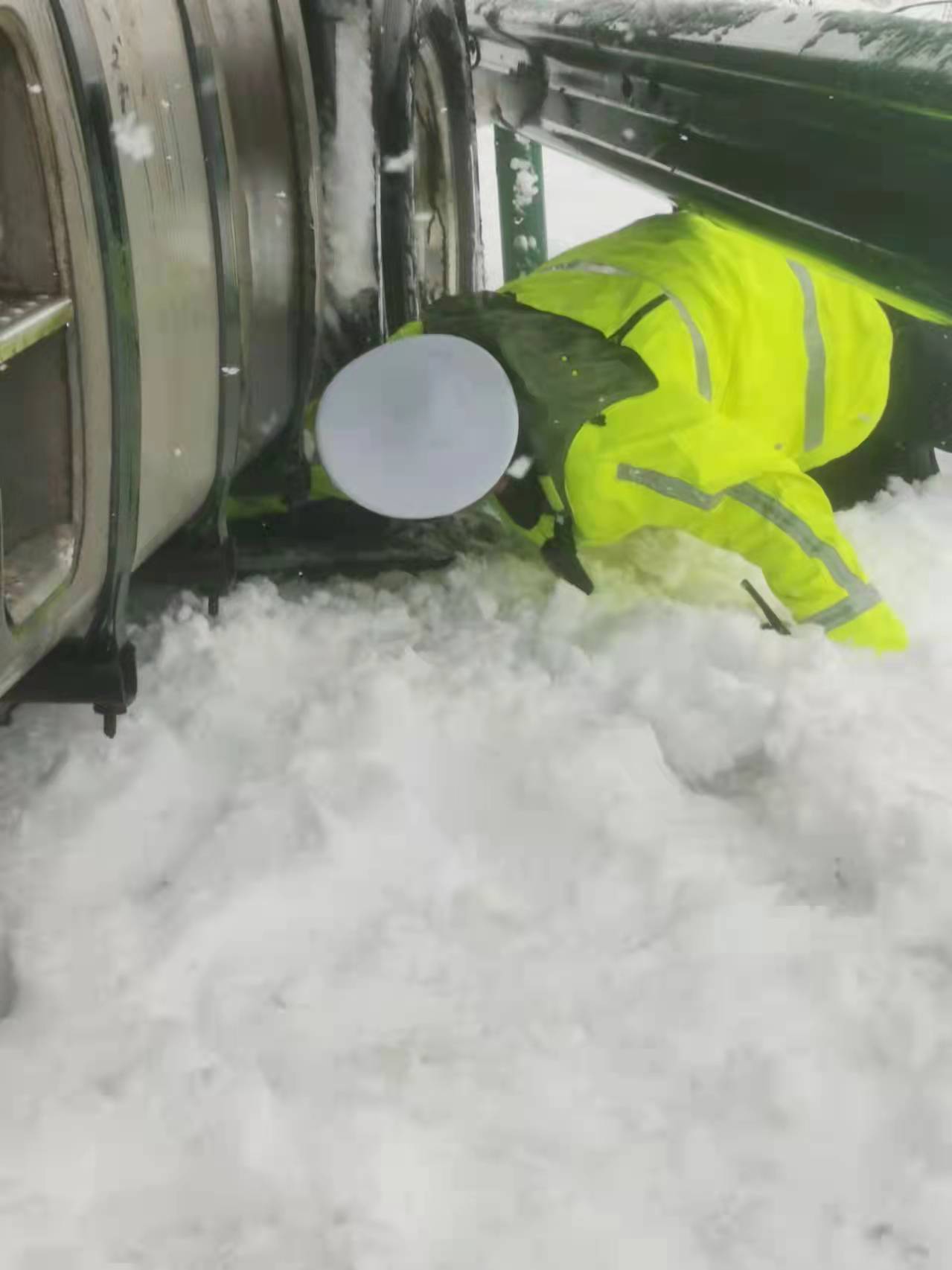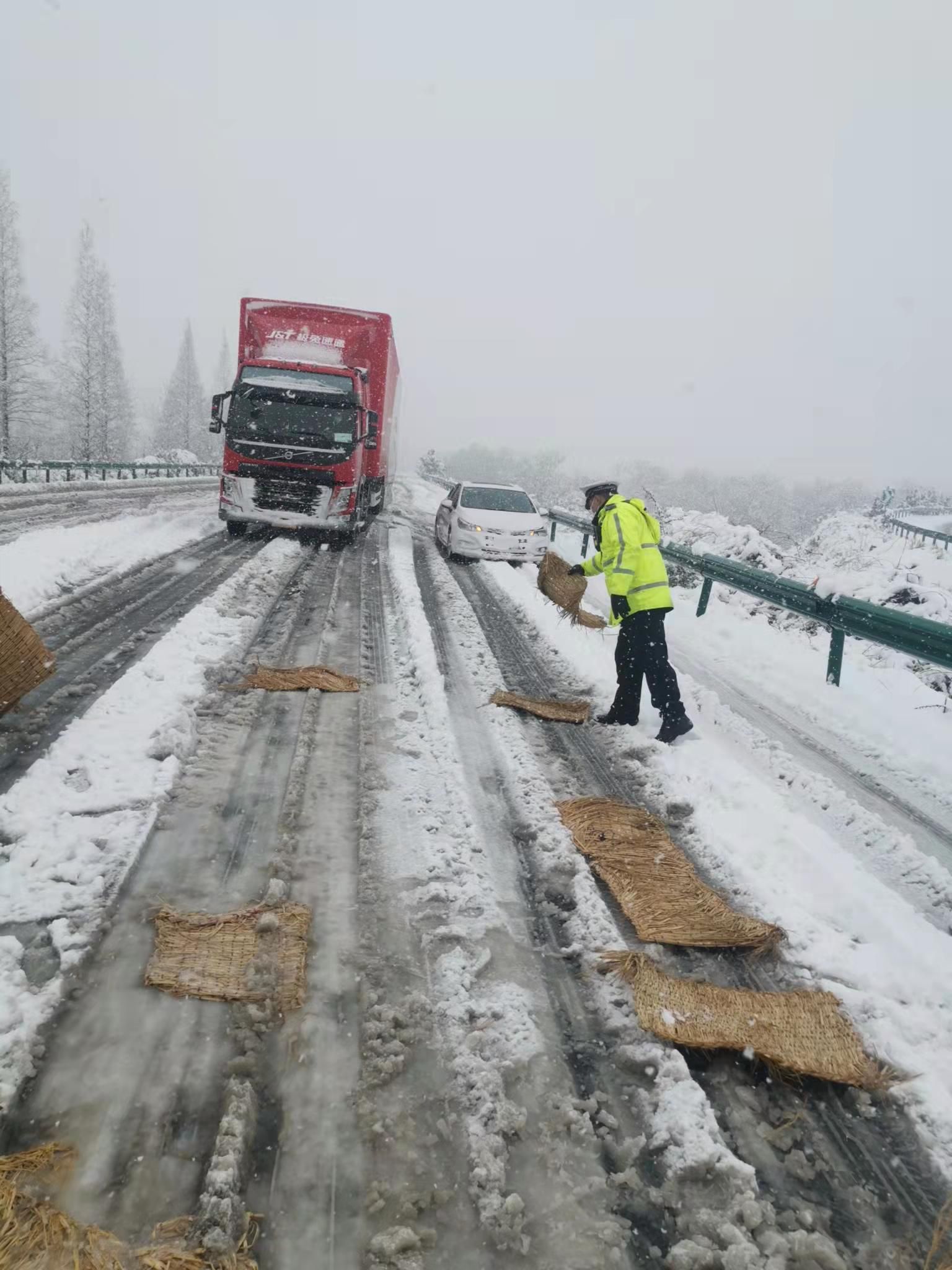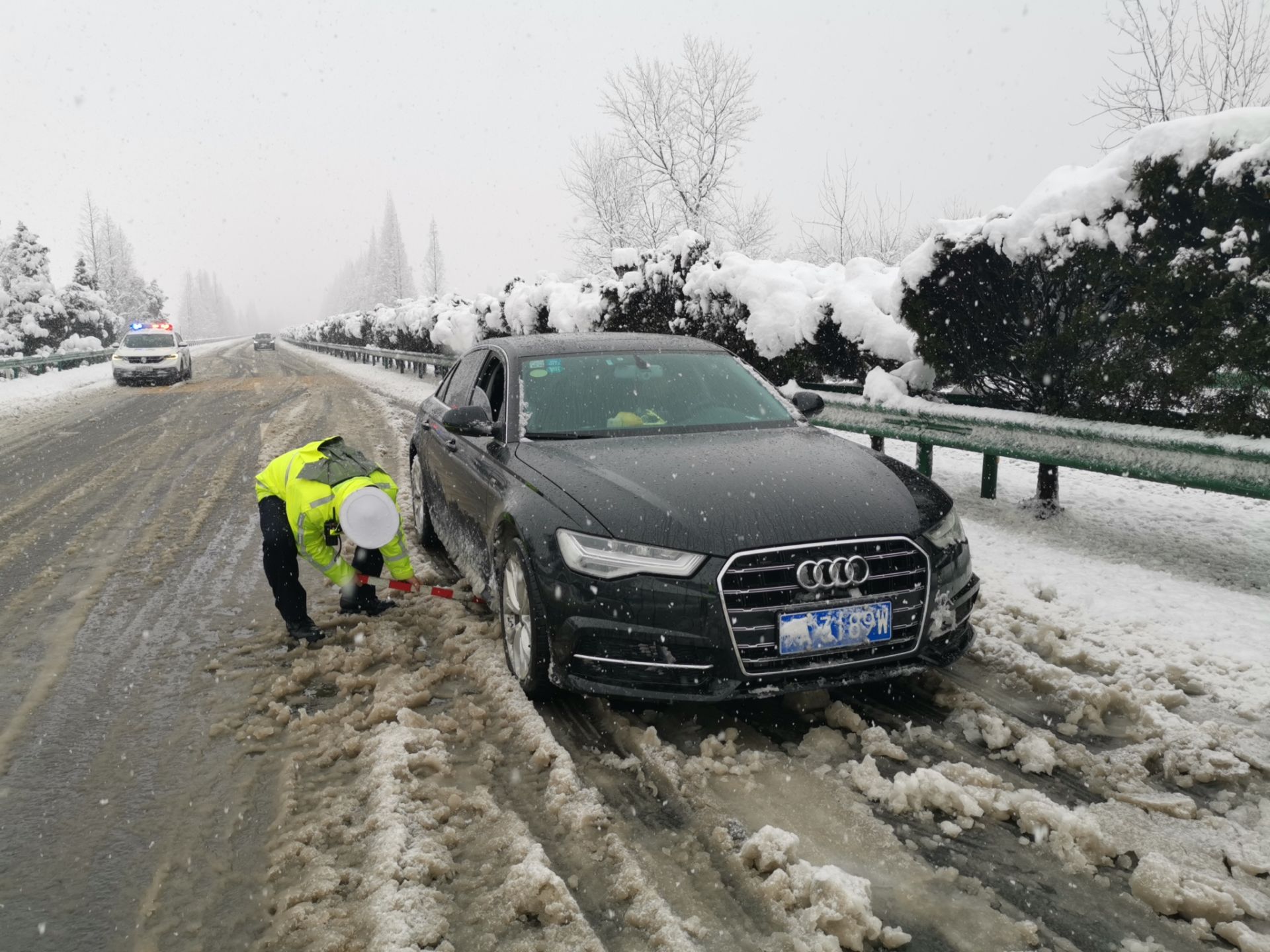 2月7日,沪渝高速、福银高速黄梅段大雪。黄梅大队在队民警全员上路,鸣笛闪灯加强巡查,分段布警。民警在大雪中不惧寒冷,加强沿线巡查,撒融雪剂,铺草甸,帮推车,实时勘察行车条件,现场及时排除安全隐患,尽力保障车辆通行。