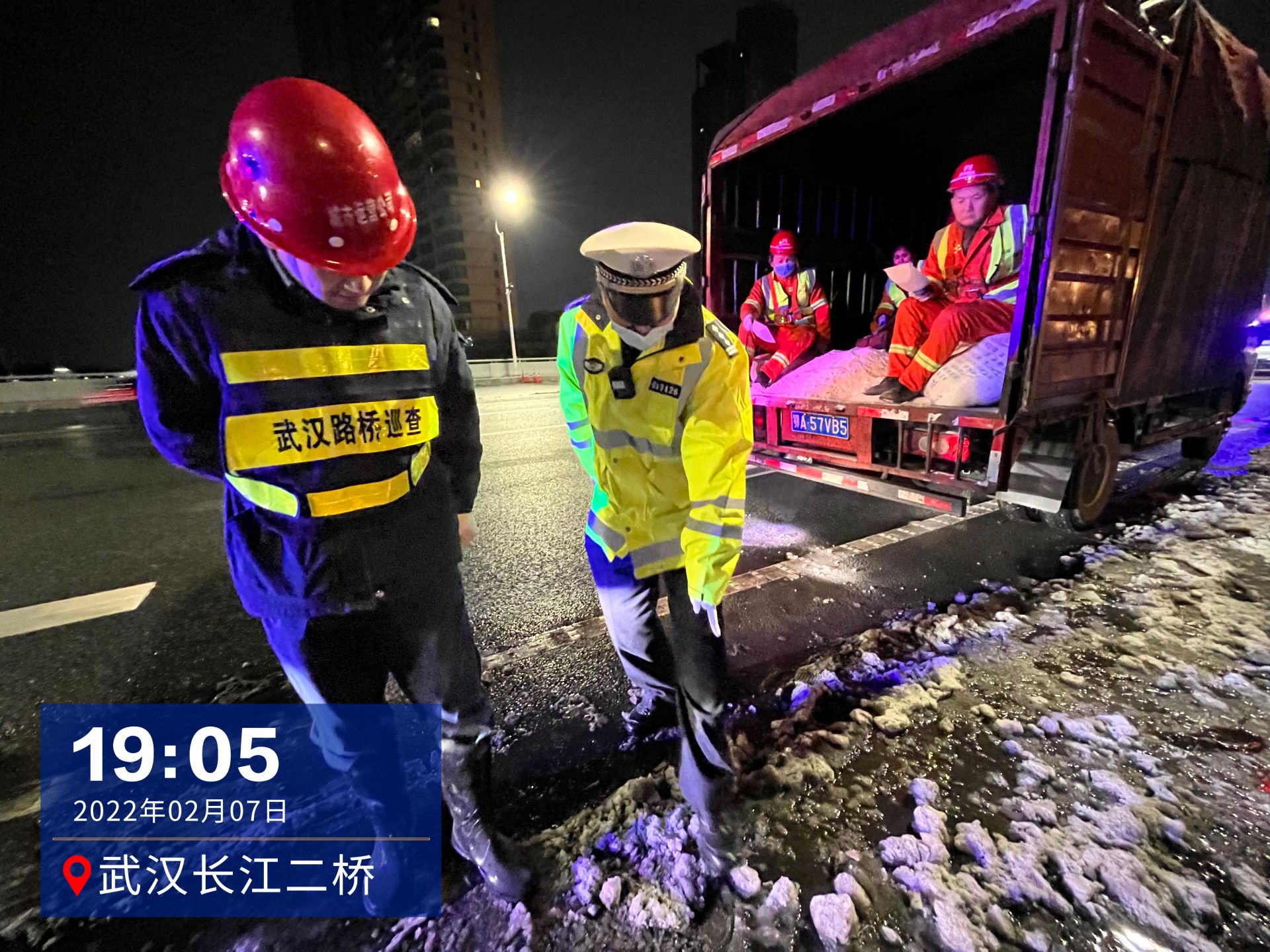 23时许,在武汉长江二桥,施工车辆正对桥面进行撒盐除冰作业,市交管局二桥大队副大队长李辉介绍,为防止行人滑倒,桥面双向人行道积雪已被扫除,他不忘提醒作业人员注意车道边沿及匝道等易结冰区域,做到除冰无死角。
