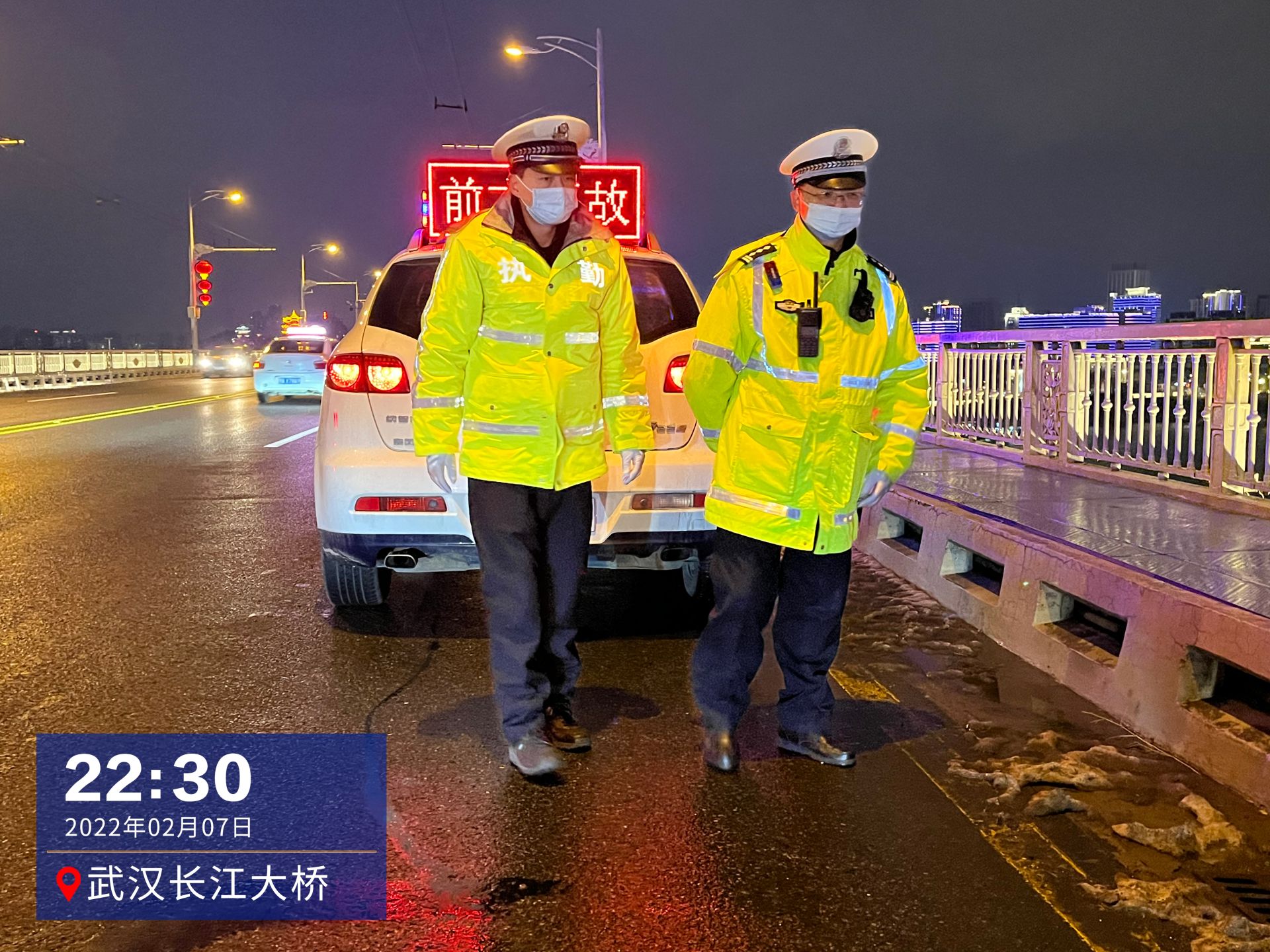 22时许,武汉长江大桥寒风刺骨,市交管局大桥大队事故中队中队长金智勇驾驶警车来到桥梁中部,携带测温仪下车查看室外温度和结冰情况,“今晚注定是个不眠夜。”每小时巡查一次,每次巡查至少半个小时,在桥面工作二三十年,这位经验丰富的交警早已习惯迎接挑战。