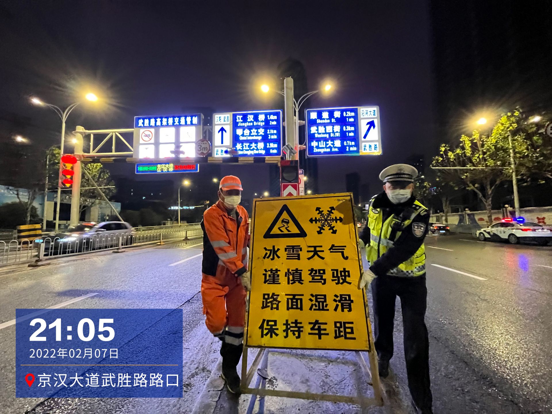 21时许,在京汉大道武胜路路口,硚口区交通大队一中队副中队长曹勇正在武胜路高架旁疏导交通,他挥舞手势引导来往车辆有序通行,同时协助设施维护人员,架设“冰雪天气谨慎驾驶”提示牌。