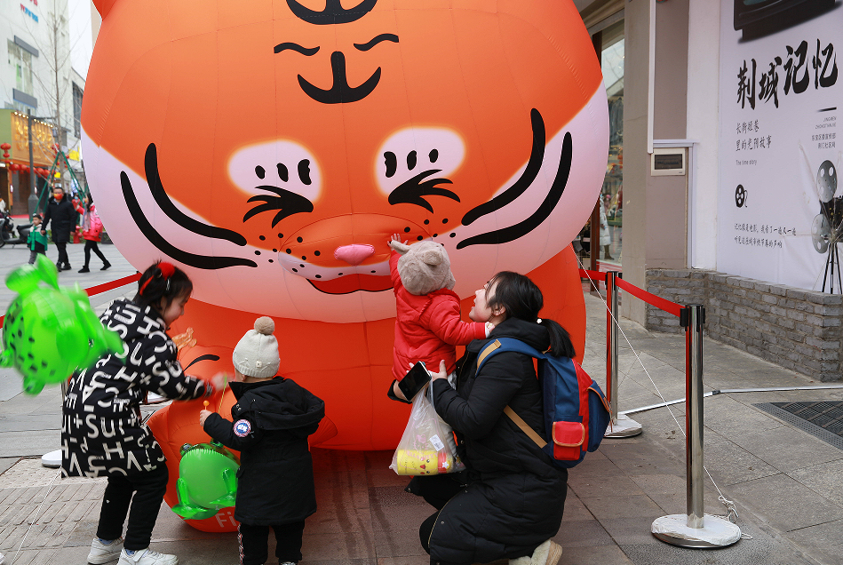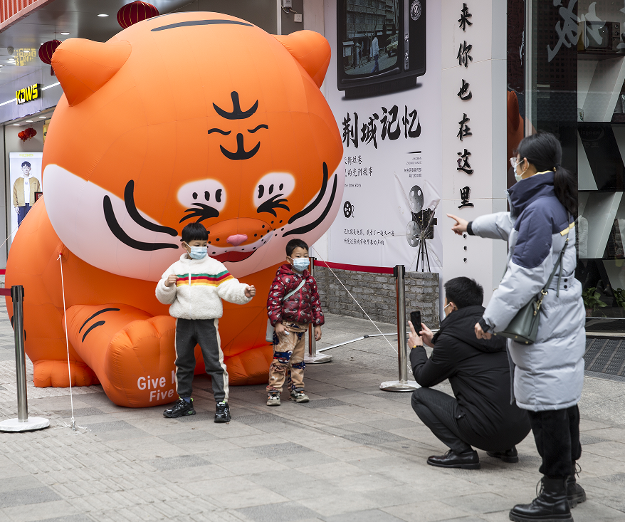 在一个充气的小老虎前,不少市民排队等待着合影,在虎年,能和可爱的“假”虎合影也是一件趣事。
