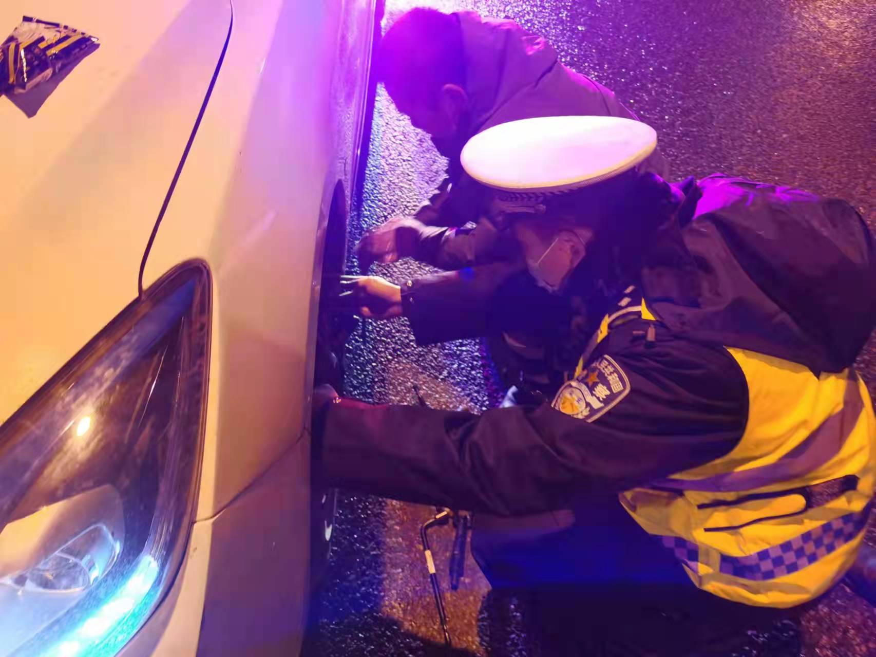 考虑到此时已是深夜,三环线上车流量虽然不大,但是晚上后车行车的视野很短,容易发生追尾二次事故,于是决定分两路开始救援,辅警李毅龙、桂聪二人负责警戒并用警车拉警笛和喊话提示后方车辆,孙军则接过司机的扳手帮助轮胎。经过半小时的努力,备胎终于换好,司机再三对民警表示感谢说:自己的车爆胎后,想着赶紧换上备胎但拆了几个螺丝手都冻僵了还时不时担心后方来车,感谢你们及时帮我换好备胎,不然这么冷的夜晚真不知怎么办。