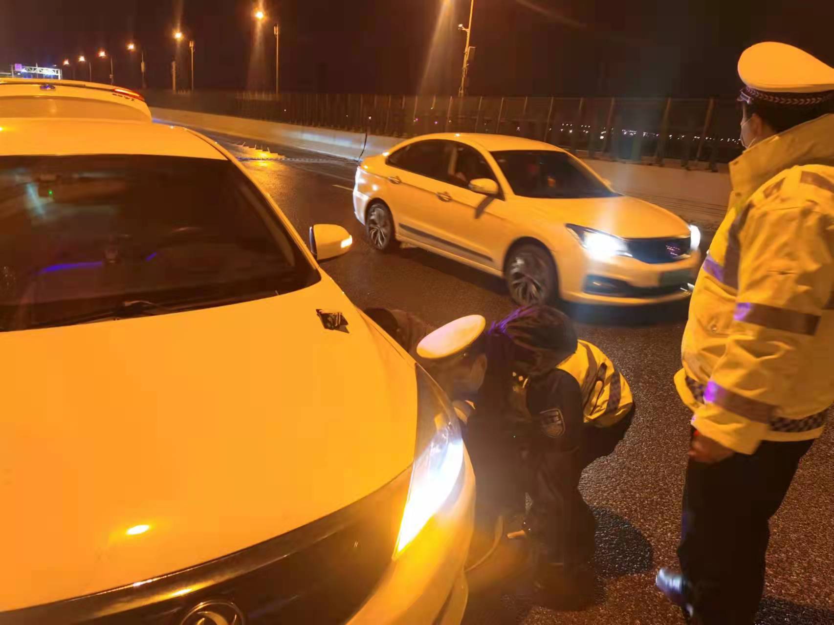 2月8日凌晨,武汉市公安局青山区交通大队民警在开展夜间巡逻时发现一台爆胎小轿车抛锚在桥面上,民警做好警戒后马上变身“换胎哥”协助驾驶员更换备胎,以最快的速度完成了换胎消除交通安全隐患。