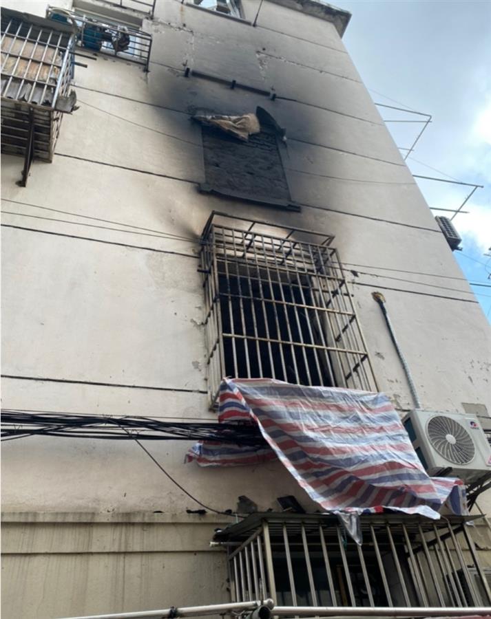 记者获取的现场视频显示,起火房屋外墙有防盗窗,明火蹿出了窗外,火势看上去较大。在居民8日下午拍到的照片中,起火房屋两面相连的外墙均已被熏黑。