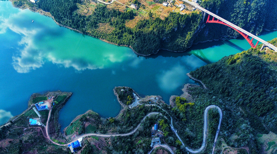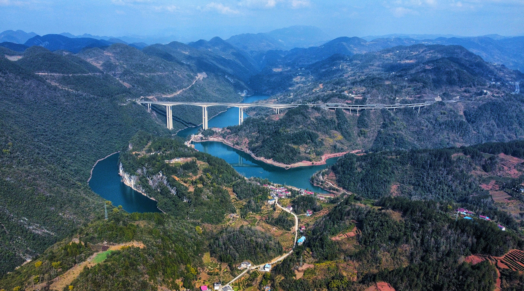 2022年春节期间,途径318国道,用无人机俯瞰湖北省恩施土家族苗族自治州恩施市崔家坝镇南里渡,娟秀柔美的马水河、318国道南里渡大桥、沪蓉西高速公路马水河特大桥相互交错,穿行于崇山峻岭之中,与苍翠青山、幽深河谷、如蓝江水、特色村居汇成了一幅美丽的山村图景。