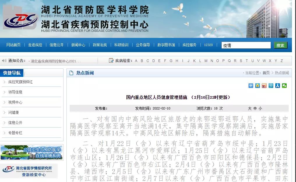 二、对1月22日(含)以来有辽宁省葫芦岛市绥中县;1月23日(含)以来有黑龙江黑河市爱辉区;1月25日(含)以来辽宁省葫芦岛市连山区;1月26日(含)以来有广西百色市田阳区和德保县;2月2日(含)以来有广西百色市右江区;2月4日(含)以来有广西百色市隆林县、靖西市;2月5日(含)以来有广东广州市番禺区大石街道和广西南宁市江南区江南街道;2月7日以来有(含)广西百色市平果市、田东县、那坡县、凌云县、乐业县、田林县、西林县旅居史的来(返)鄂人员,集中隔离医学观察至离开当地满14天,集中隔离医学观察期满后,实施居家隔离医学观察14天。管控区域调整后,相关健康管理措施和时间随之调整。