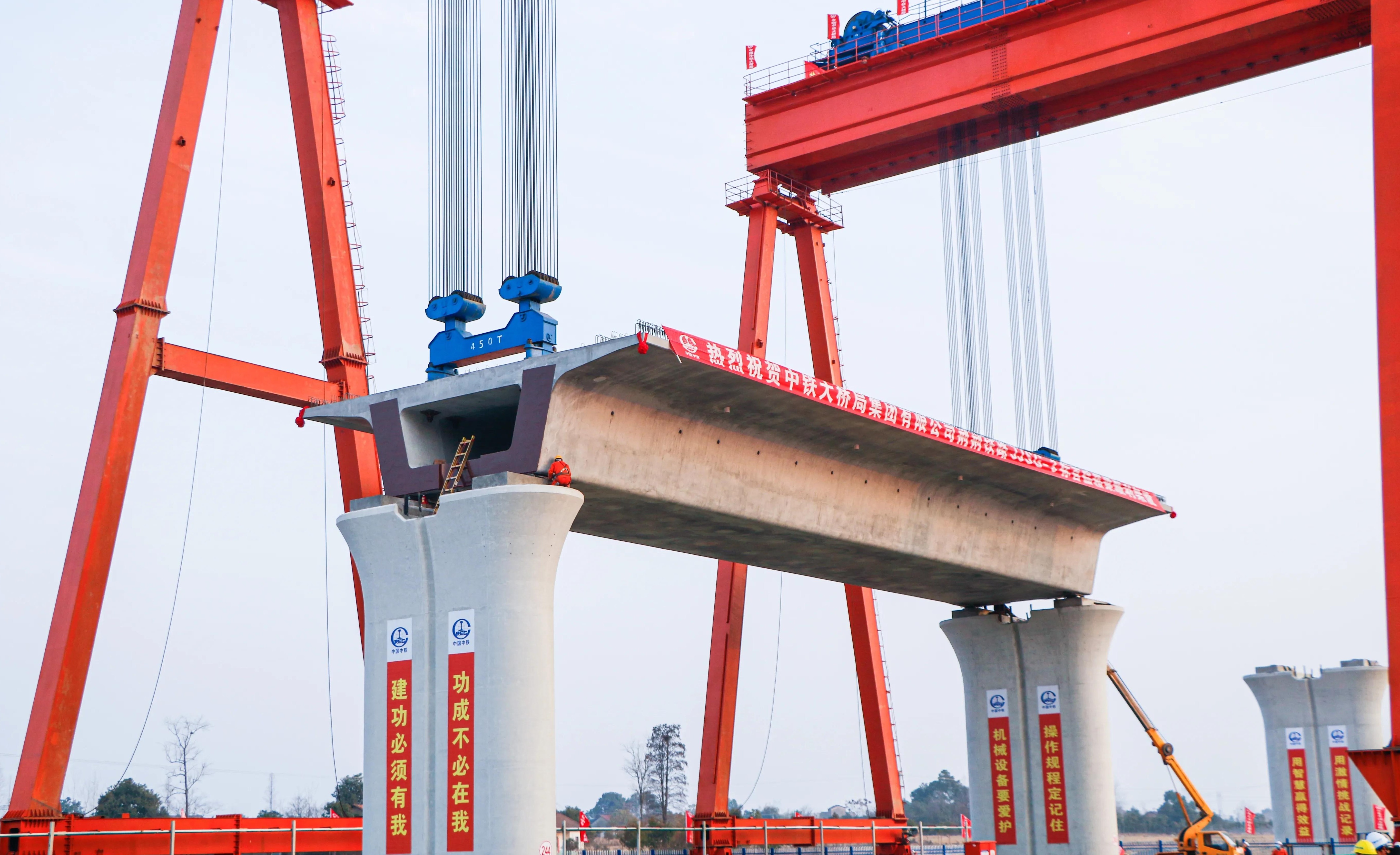 2月13日下午,随着重790余吨、长32.6米的预制混凝土简支箱梁平稳落在荆荆铁路江汉运河特大桥244-245号墩上,由中铁大桥局承建的荆荆铁路3标首榀箱梁架设顺利完成。
