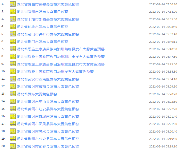 武汉中心气象台2022年02月14日05时25分发布大雾黄色预警信号:目前,武汉、襄阳、荆门、荆州、潜江、孝感、随州、黄冈北部、恩施部分地区已出现能见度小于500米,局部小于200米的雾,预计今天上午仍将持续,请注意防范。湖北多地发布大雾预警