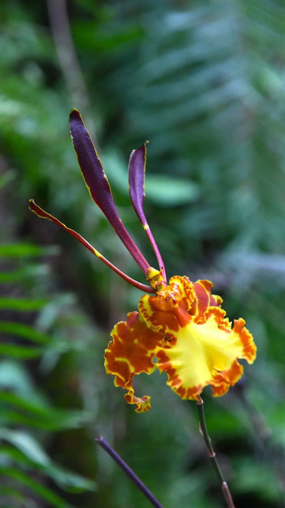 魔鬼文心兰叶形如兔耳,叶背常饰以紫红色斑点;花单生于花序顶端,花形酷似一只鲜艳蝴蝶,细长的花瓣就像蝴蝶长长的触须,侧萼片像翅膀,唇瓣仿佛富有动感褶皱和裙摆散开飘逸的华丽礼服,使人赏心悦目。