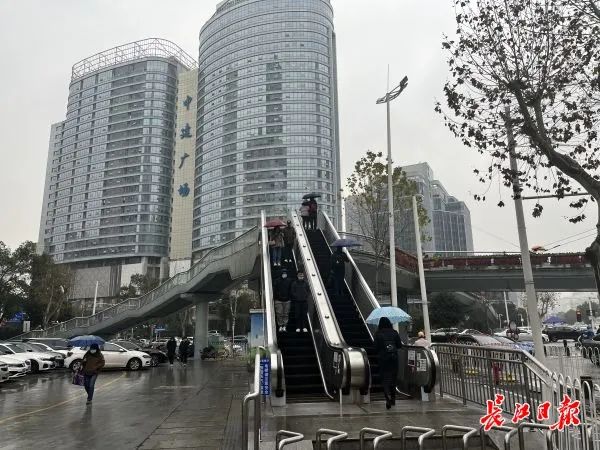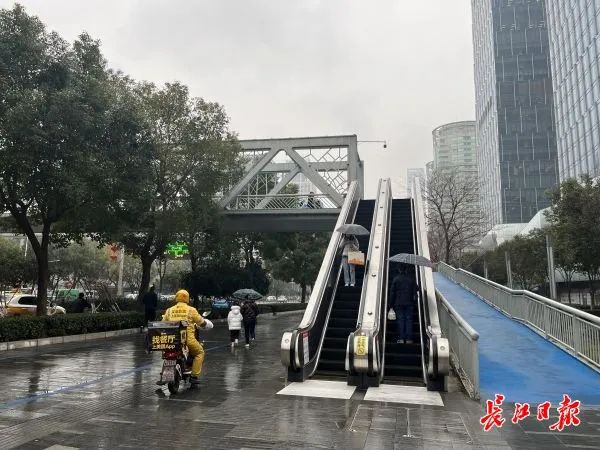 在武珞路与中南路路口的武珞路人行天桥,在武珞路两侧配备了手扶电梯,下雨天也在正常运行中。