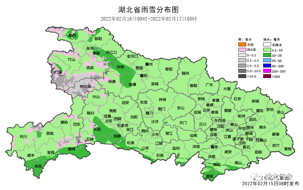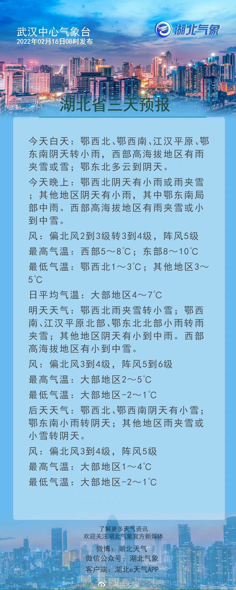 明天(17日),鄂西、江汉平原北部、鄂东北北部小雨转雨夹雪或小雪,高海拔地区小到中雪,局部大雪,其他地区小到中雨,气温再度下跌,最高气温北部仅2~4℃,南部4~6℃,最低气温0~5℃。