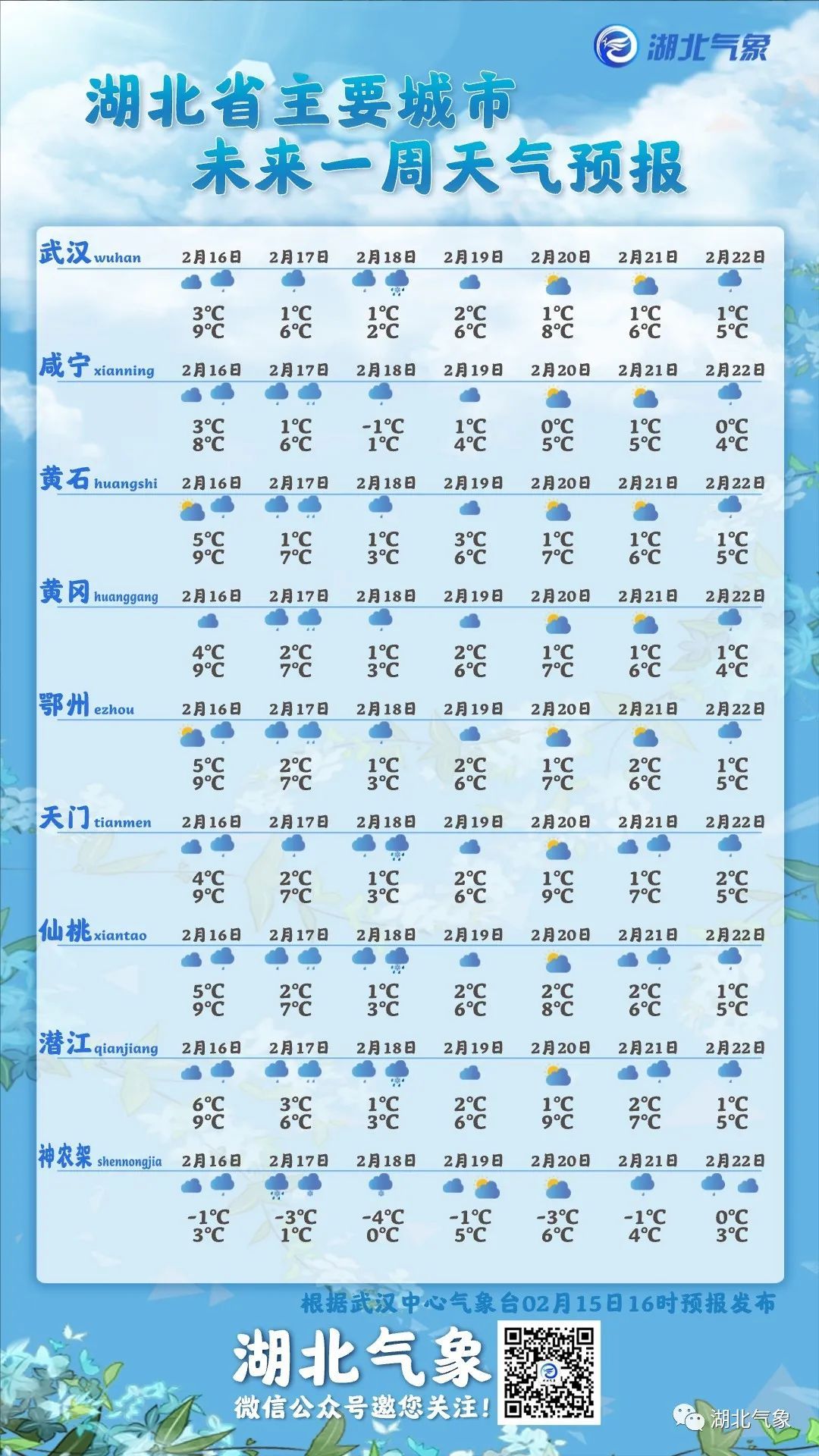 今天(16日),鄂西和江汉平原南部小到中雨,其他地区多云转小雨,鄂西高海拔地区有雨夹雪或雪,大部地区最高气温将降至6~9℃,最低气温2~5℃。