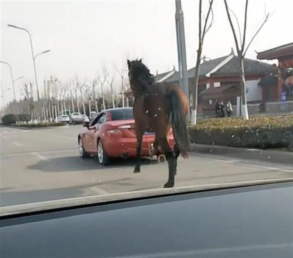 网传视频显示,在一条公路上,有来往车辆正常行驶,一辆红色轿车尾部拴着一匹马行驶,马儿紧紧跟在小汽车后面奔跑。有网友表示:“这才是真正的宝马。”但也有网友表示担心:“这马惊了就危险了。”有网友表示事发地在河南商丘火神台附近,视频拍摄者予以肯定。