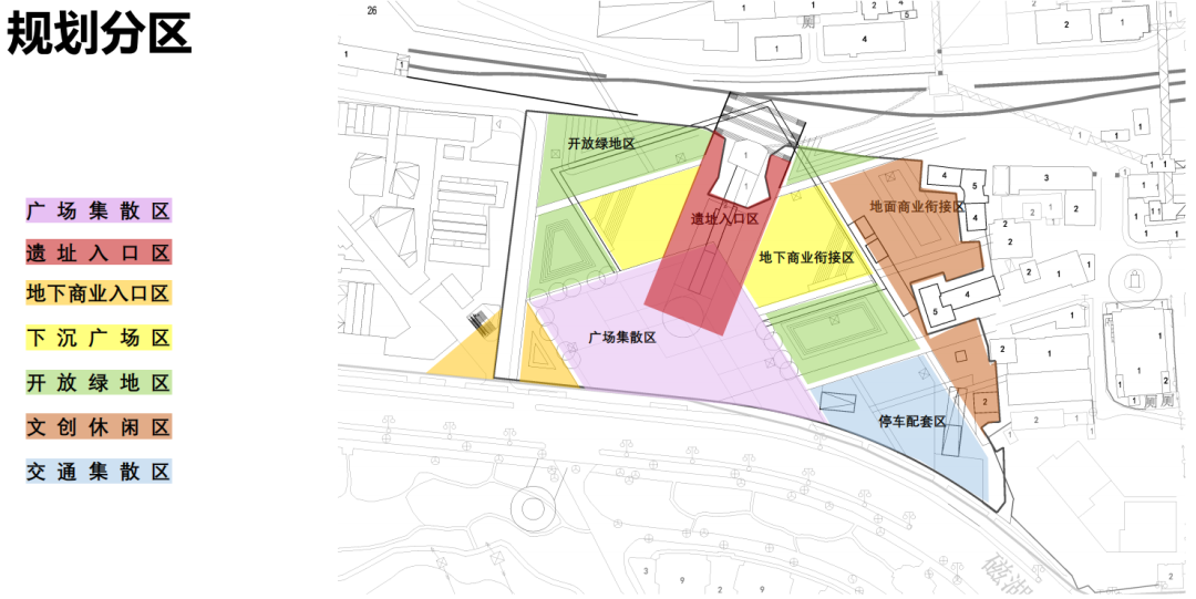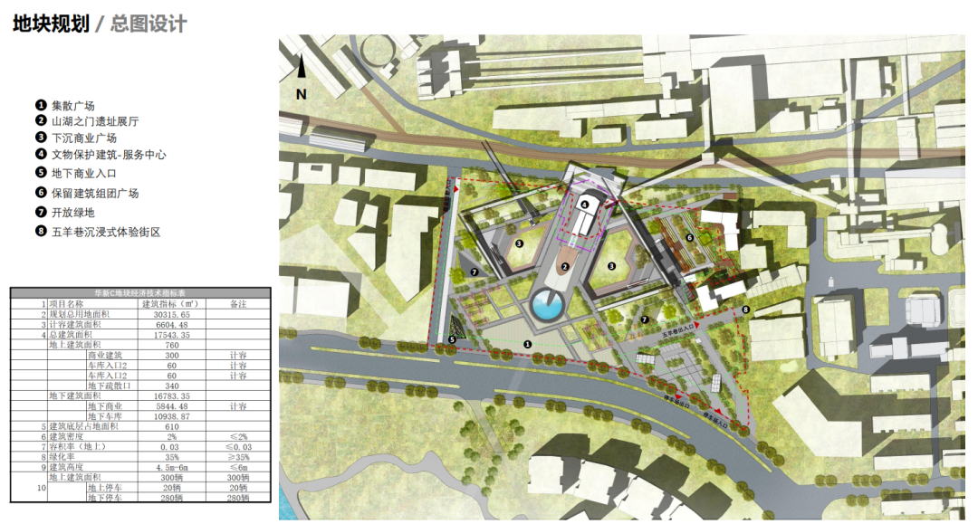 此次得到批复的市政广场项目总用地面积30174.48㎡,总建筑面积17543.35㎡,拥有地上一层,地下一层。项目涵盖集散广场、 山湖之门遗址展厅、下沉商业广场、文物保护建筑-服务中心、地下商业入口、 保留建筑组团广场、开放绿地、 五羊巷沉浸式体验街区等8大板块。