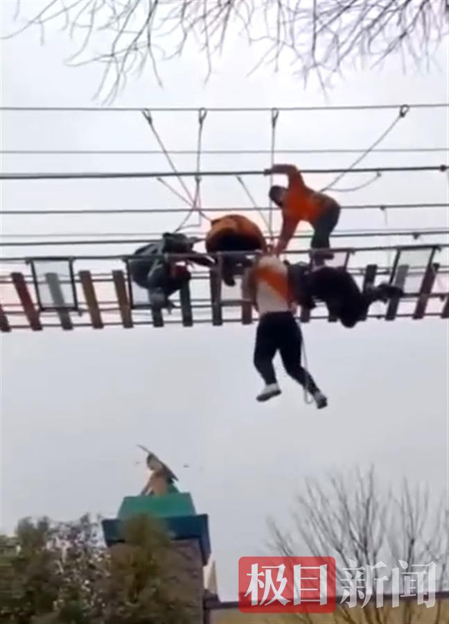 网传视频显示,在一处吊桥上,一名女子落入吊桥的空当处,手抓着玻璃板,身上系有安全设施。吊桥上有三个人展开救援,希望能将其重新拉回桥面,但最终这名游客还是从桥上坠下。