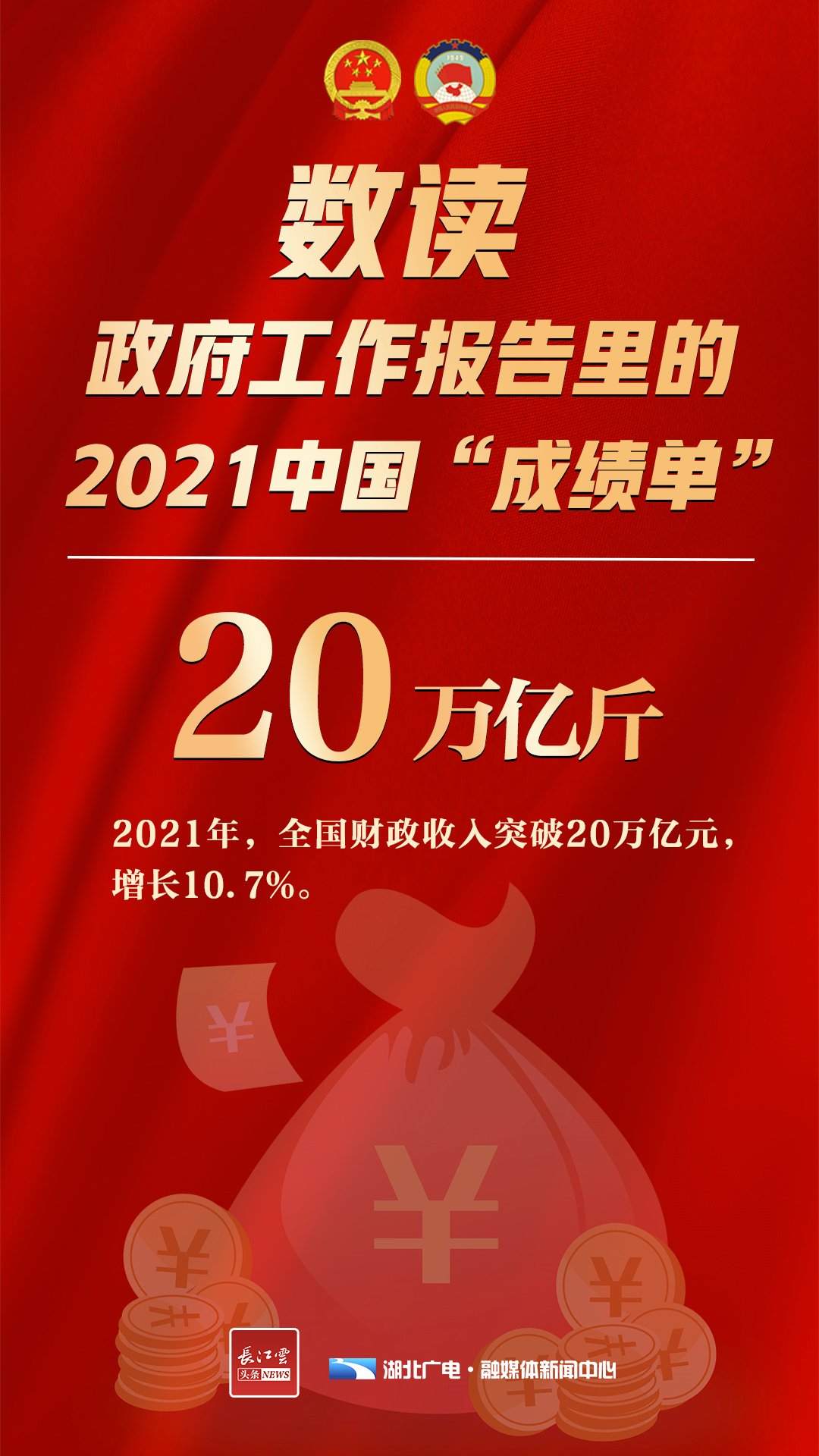 2022年3月5日上午9时,第十三届全国人民代表大会第五次会议在人民大会堂举行开幕会。国务院总理李克强代表国务院,向十三届全国人大五次会议作政府工作报告。政府工作报告中指出:2021年,全国财政收入突破20万亿元,增长10.7%。
