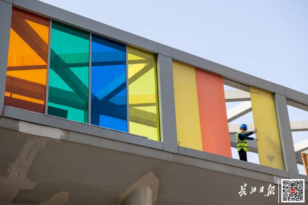 3月4日,在园林路临江大道路口,工人们正在为栈桥护栏装上彩色玻璃,未来,这里将诞生武汉市第一座室外彩虹桥。记者任勇 摄天桥架在园林路道路两侧,桥下有斑马线,车流较少,路人行走如常。“这座园林路人行栈桥,是武昌生态文化长廊工程的配套建设内容,将为大家畅游长廊提供无障碍的人行或骑行体验。”市城投集团公司所属铁投公司项目现场负责人占广健介绍,该路口为原武九铁路与园林路交叉口,园林路打通拓宽后,将成为一条双向六车道的城市主干道。