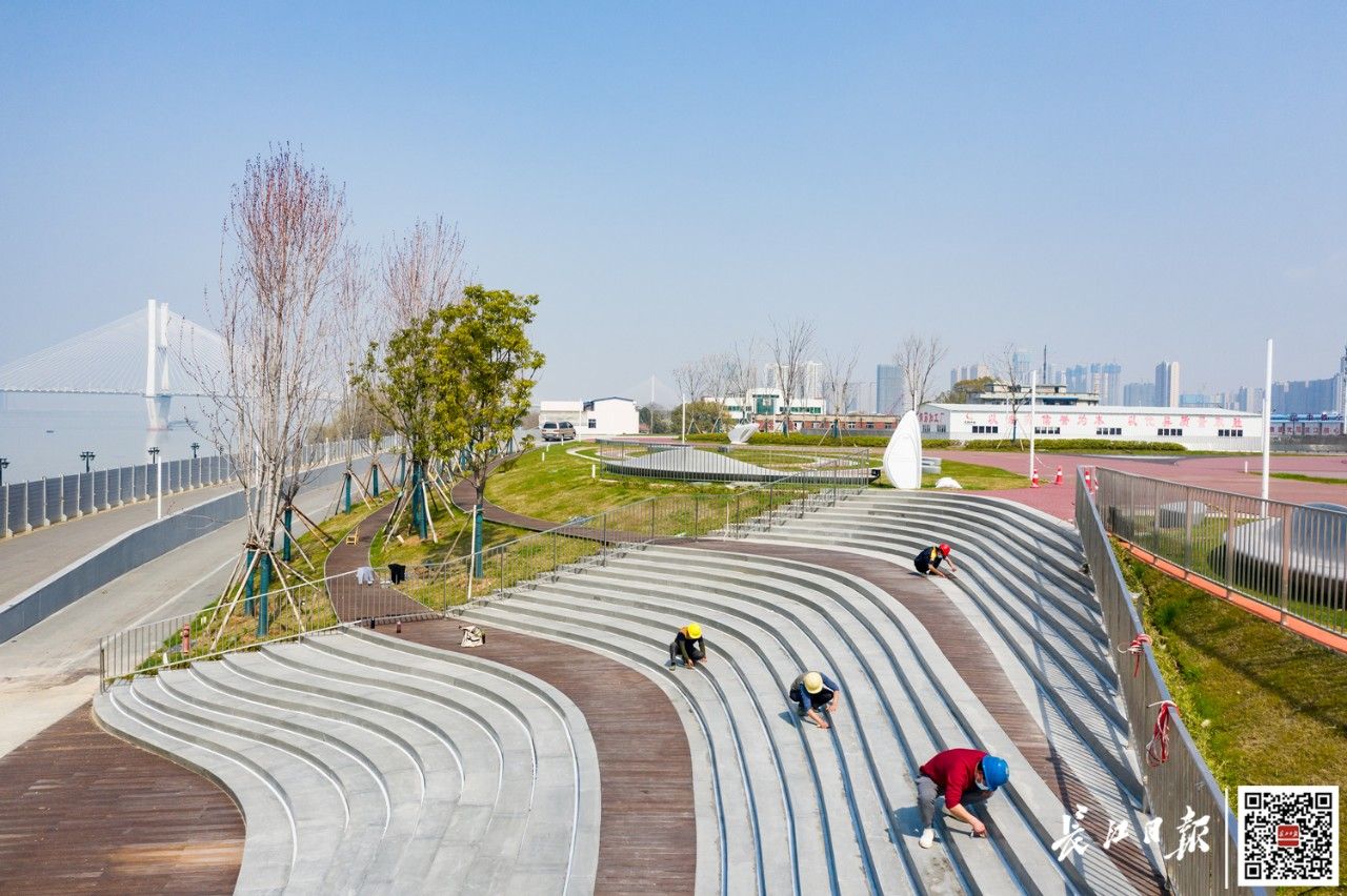 花红草绿,春意萌动江城,武汉最佳看江点位进展如何?3月4日,记者探访武汉月亮湾城市阳台一期工程,施工人员正在精雕细琢水磨石阶梯,打磨兼具通行和休憩功能的看江观景最佳“观众席”。