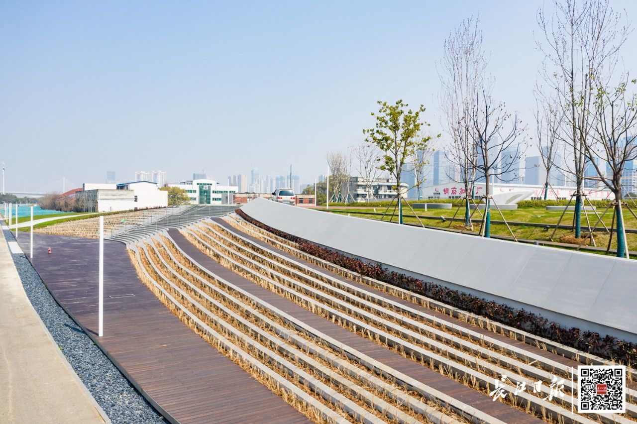 记者看到,背江的2号台阶又有奥妙不同,台阶设计错落有致,中段阶梯供人步行或休憩,过渡到两端变成绿化带,种满狼尾草、细叶芒、麦冬等植物,层层叠叠煞是热闹。