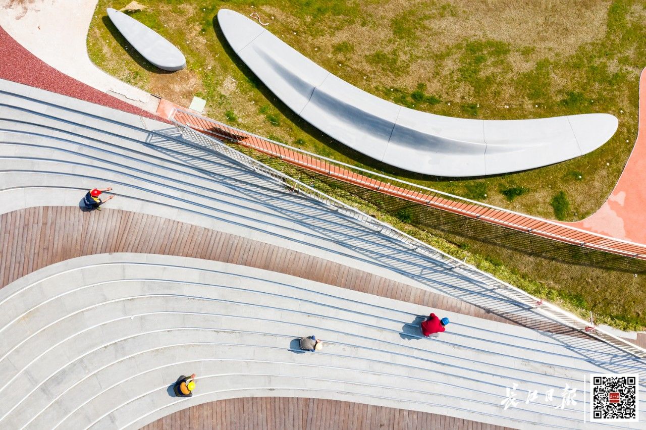 月亮湾城市阳台是一个分层立体平台联动的建筑、景观和慢行系统。据了解,一期工程中有8个这样的异形大台阶。