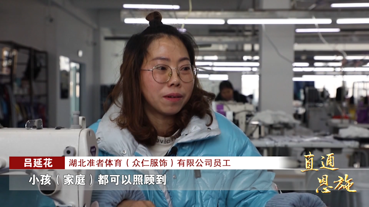 湖北准者体育(众仁服饰)有限公司员工 吕延花:“现在就在家里每月可挣三四千元,小孩(家庭)都可以照顾到。”