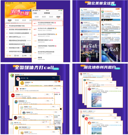 举全台之力,更与学习强国、人民日报 新华社、央视新闻、央视频等央媒平台,以及新浪、头条、腾讯 、抖音、快手、斗鱼直播等商业平台联动,在全网掀起了一个又一个热门话题,打造现象级传播。省内联合宜昌、襄阳等百余市州县推出互动产品《湖北全球秀·某某在湖北秀秀家乡美》,121个云上系列客户端全程参与活动宣推。省外联动北京、上海、山东20余省广播、互联网等主流媒体和协作体,发布联名微博“某某再为湖北加把劲!”;学习强国平台首页推荐、人民日报、人民网、新华社、新华网、央视新闻、央视网等齐齐转发本台新媒体产品,人民日报、新华网等出现多个新媒体爆款。商业平台方面,微信朋友圈推广、腾讯新闻卡页等核心资源安排给两部大片,今日头条第一时间弹窗推送湖北新闻发布的外交部湖北全球特别推介活动动态新闻稿。#外交部向全球特别推介湖北#话题被微博热搜榜置顶,居武汉同城榜首位、要闻榜第4位、热搜第6位。