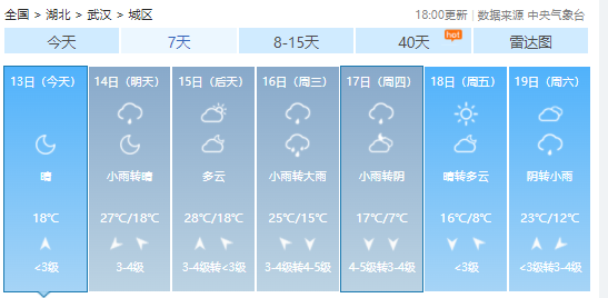据中国天气网天气预报显示,武汉3月17日和3月18日,最高温或降至20℃以下,最低温仅7℃-8℃左右,3月中下旬相对上旬有较为明显的降温。