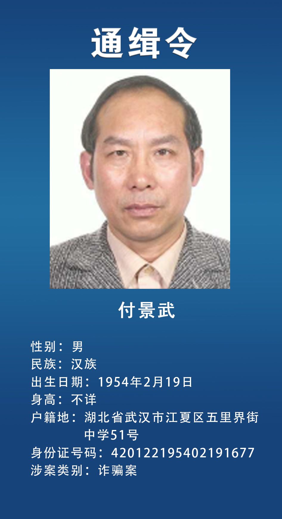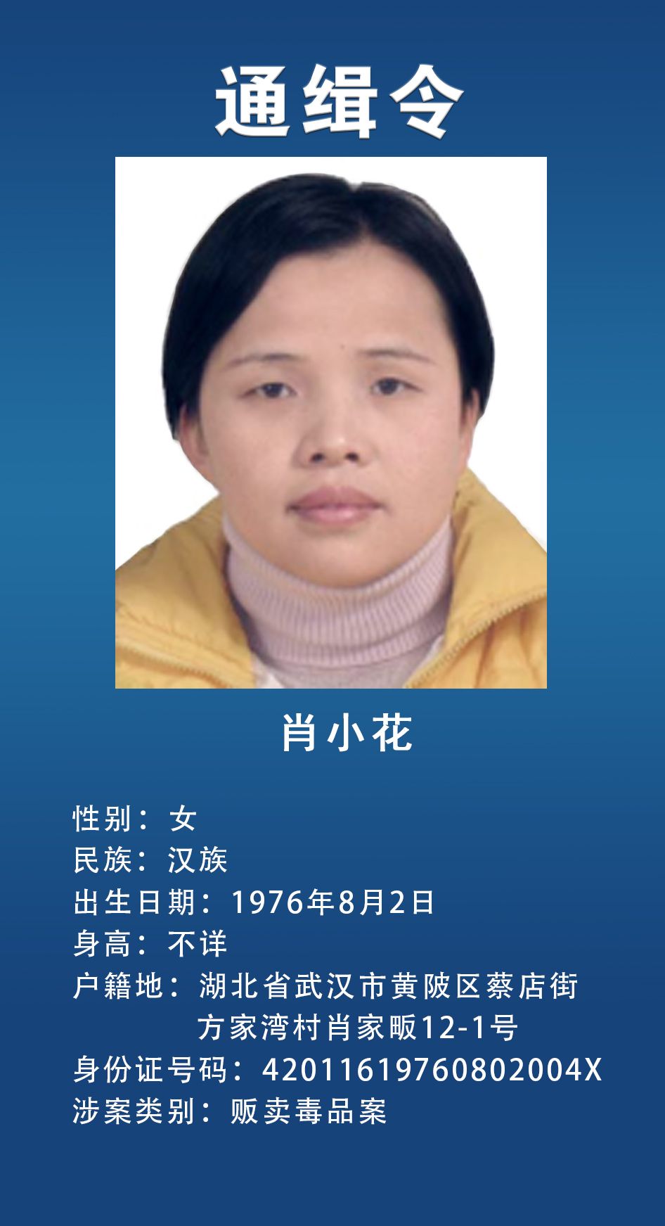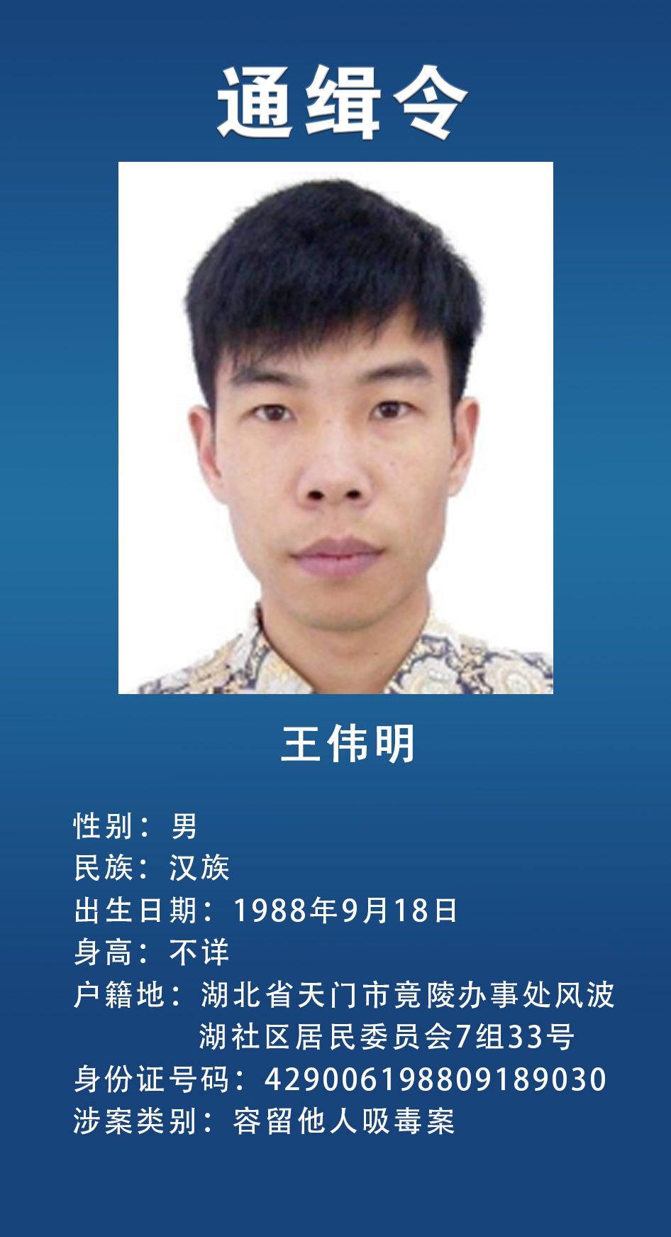湖北省公安厅正告在逃人员于2022年3月25日前主动投案,争取宽大处理,对如实供述自己罪行的,可依法从轻、减轻或者免除处罚。为在逃人员提供隐藏处所、财物和交通、通讯工具,为其通风报信或者作假证明包庇,或者提供其他便利条件帮助其逃匿的,公安机关将依法追究法律责任。举报邮箱及电话:hbsxzwlzt@163.com、各地110。