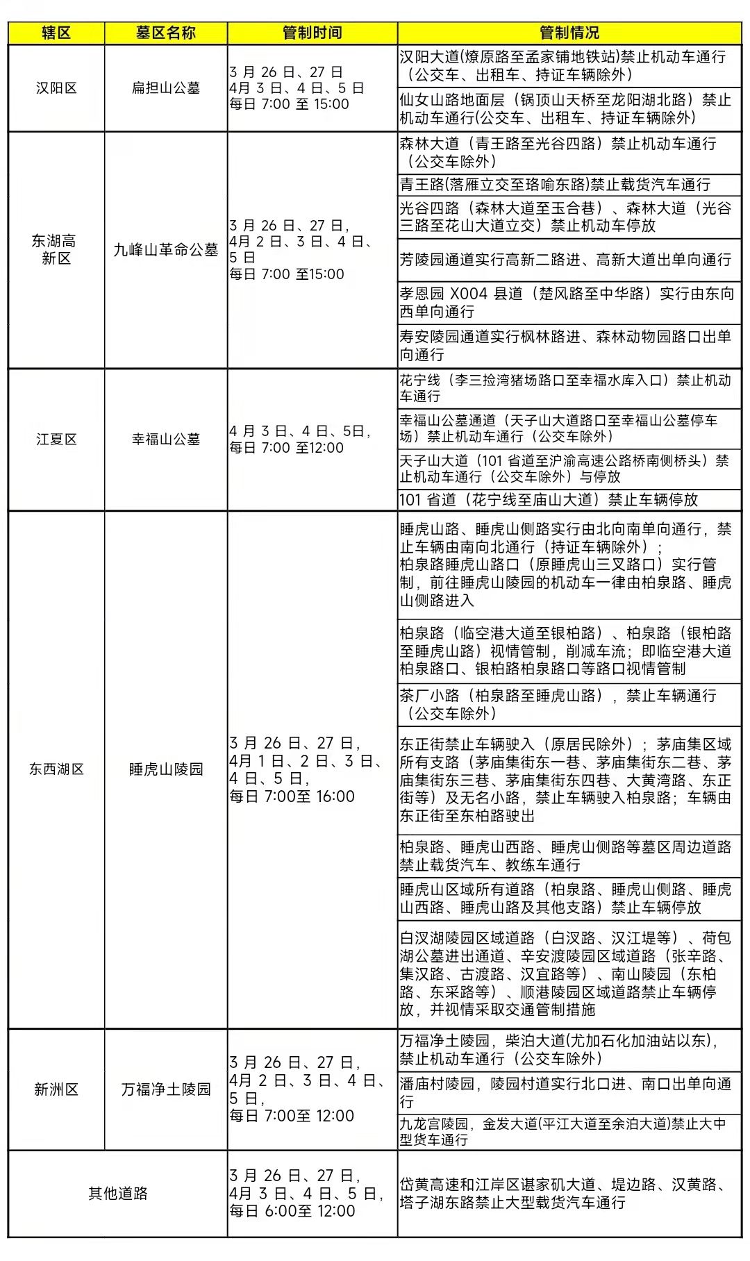 3 月26日、27日,4月1日、2日、3日、4日、5日每日 7:00至 16:00睡虎山路、睡虎山侧路实行由北向南单向通行,禁止车辆由南向北通行(持证车辆除外);柏泉路睡虎山路口(原睡虎山三叉路口)实行管制,前往睡虎山陵园的机动车一律由柏泉路、睡虎山侧路进入;茶厂小路(柏泉路至睡虎山路),禁止车辆通行(公交车除外);东正街禁止车辆驶入(原居民除外);茅庙集区域所有支路(茅庙集街东一巷、茅庙集街东二巷、茅庙集街东三巷、茅庙集街东四巷、大黄湾路、东正街等)及无名小路,禁止车辆驶入柏泉路;车辆由东正街至东柏路驶出;睡虎山区域所有道路(柏泉路、睡虎山侧路、睡虎山西路、睡虎山路及其他支路)禁止车辆停放;柏泉路、睡虎山西路、睡虎山侧路等墓区周边道路禁止载货汽车、教练车通行;柏泉路(临空港大道至银柏路)、柏泉路(银柏路至睡虎山路)视情管制,削减车流;即临空港大道柏泉路口、银柏路柏泉路口等路口视情管制;白汊湖陵园区域道路(白汊路、汉江堤等)、荷包湖公墓进出通道、辛安渡陵园区域道路(张辛路、集汉路、古渡路、汉宜路等)、南山陵园(东柏路、东采路等)、顺港陵园区域道路禁止车辆停放,并视情采取交通管制措施。