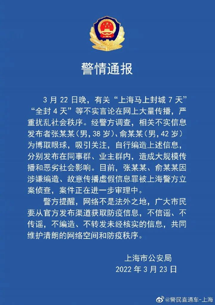 3月23日,澎湃新闻记者从上海警方获悉,3月22日晚,有关“上海马上封城7天”“全封4天”等不实言论在网上大量传播,严重扰乱社会秩序。经警方调查,相关不实信息发布者张某某(男,38岁)、俞某某(男,42岁)为博取眼球,吸引关注,自行编造上述信息,分别发布在同事群、业主群内,造成大规模传播和恶劣社会影响。目前,张某某、俞某某因涉嫌编造、故意传播虚假信息罪被上海警方立案侦查,案件正在进一步审理中。