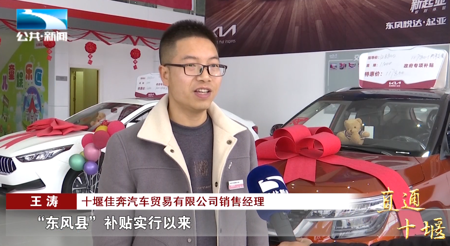 十堰佳奔汽车贸易有限公司销售经理 王涛:“‘东风县’补贴实行以来,我们相比较于往年的同月(销量)大概涨幅30%到35%,现在东风全系所有品牌,加上地方的一个正常优惠,基本上可以做到东风全系品牌达到全国最低的销售价格。”
