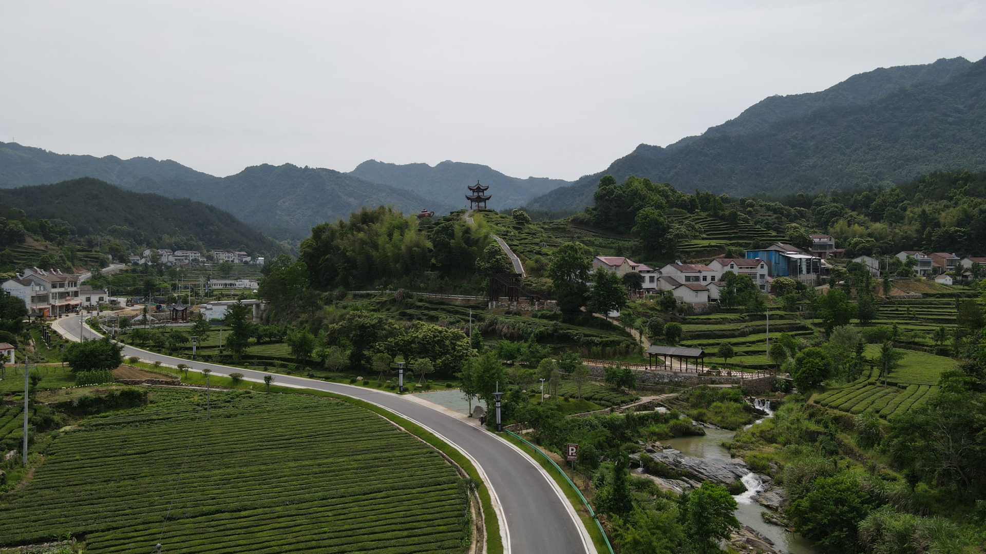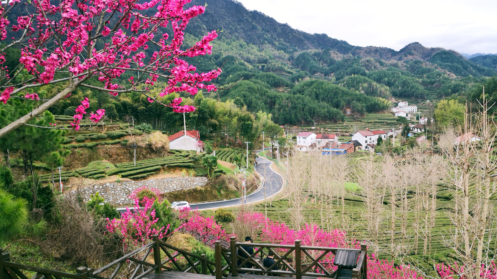 走过幸福桥,沿着茶山步游道,登上聚闲亭,只见硕大棕色的茶山天壶、满眼绿色的垄垄茶园、鲜红亮眼的棵棵桃树、绕村畅通的沥青公路、沿路而建的农家别墅、望不到头的起伏群山,人路景和谐相融,不是桃花源胜似《桃花源》,令人心情舒畅、心旷神怡。
