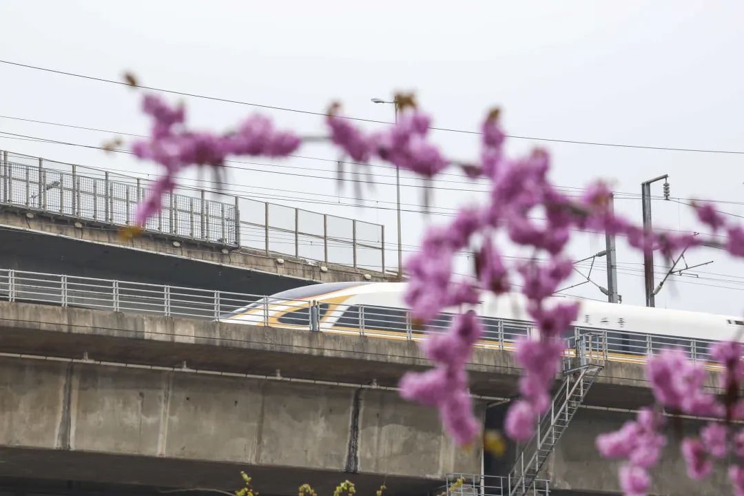 “呼呼呼”,一列复兴号从花影间疾驰而过。这般高速位移不禁让人好奇,列车上的旅人会看到怎样的巨紫荆呢?