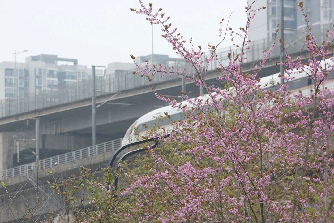 闭上眼睛,幻想这样一幅画面:当你转换视角,在飞驰的复兴号上,高铁驶入长江南岸,一片粉色祥云“冲”入眼帘,一定会让你惊呼,好美啊!