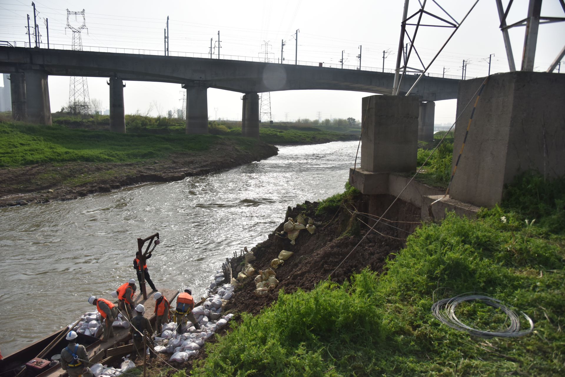 入春以来,受连续强降雨天气的影响,武汉境市内多条河流水位上涨。3月27日,国网武汉供电公司输电运检分公司在对220千伏阳李一二回进行雨后特巡时,发现63号铁塔基础被府澴河河水冲刷损坏严重,出现塌方亟需抢修。