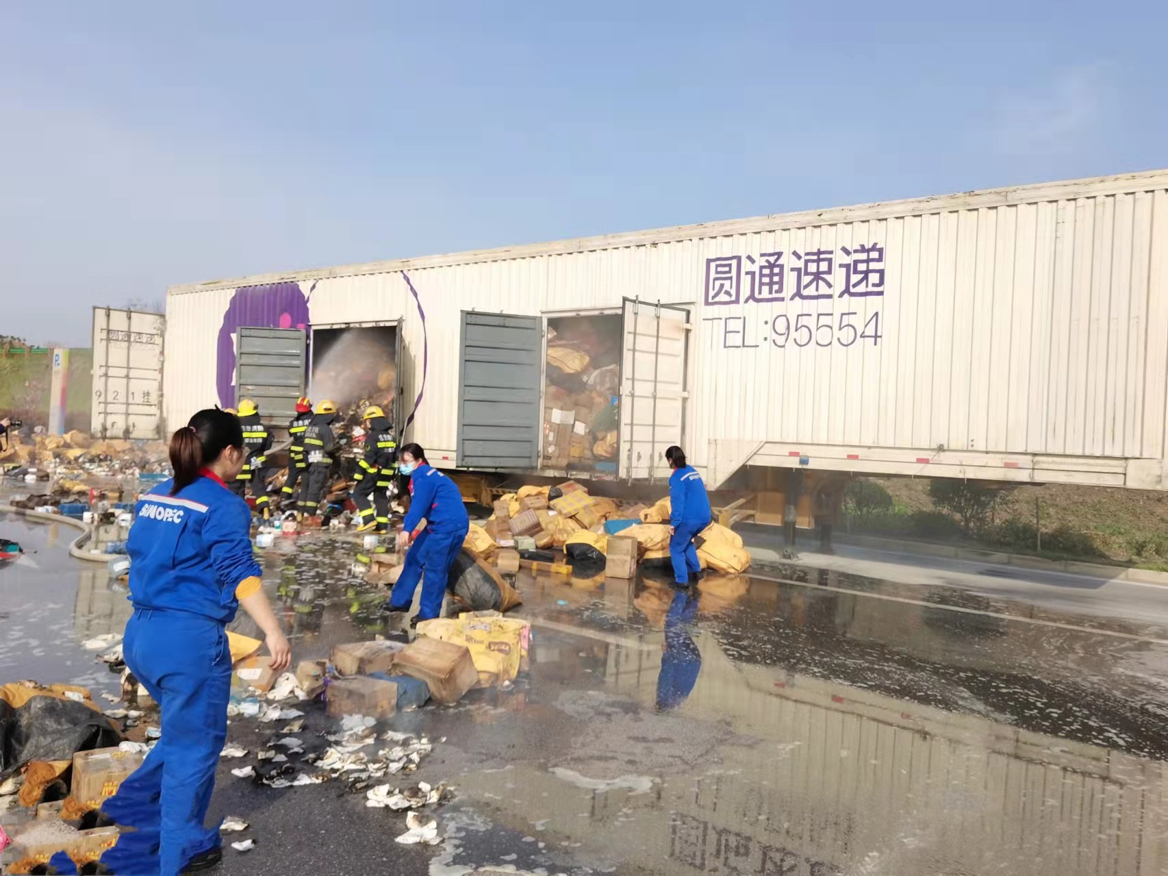 着火车辆是一辆白色的厢式半挂车,车上装了满满一车快递物件,都是易燃品,火势燃烧迅猛。万凤霞指挥救火人员分三组行动:一组人员用灭火器灭火;一组人员连接消防水带灭火;一组人员找来耙子等工具,抢运货物,阻断燃烧路线。