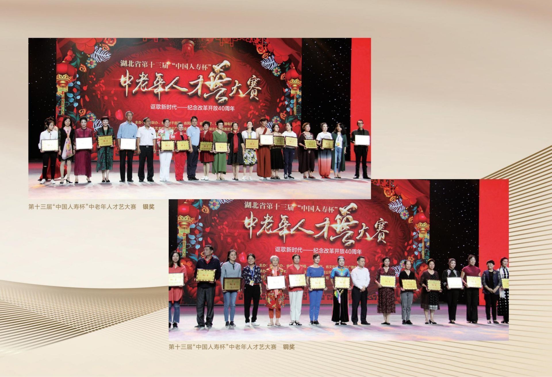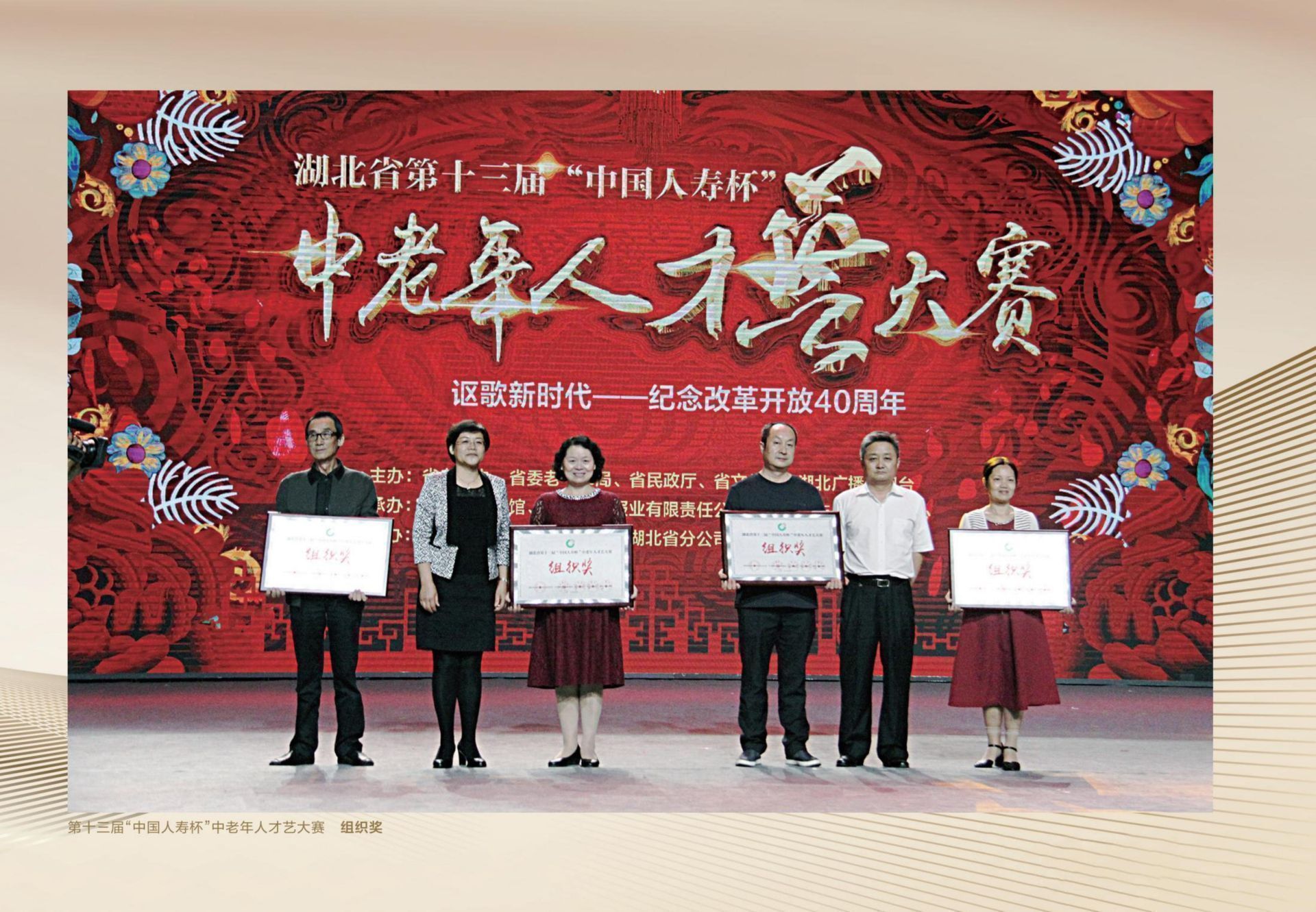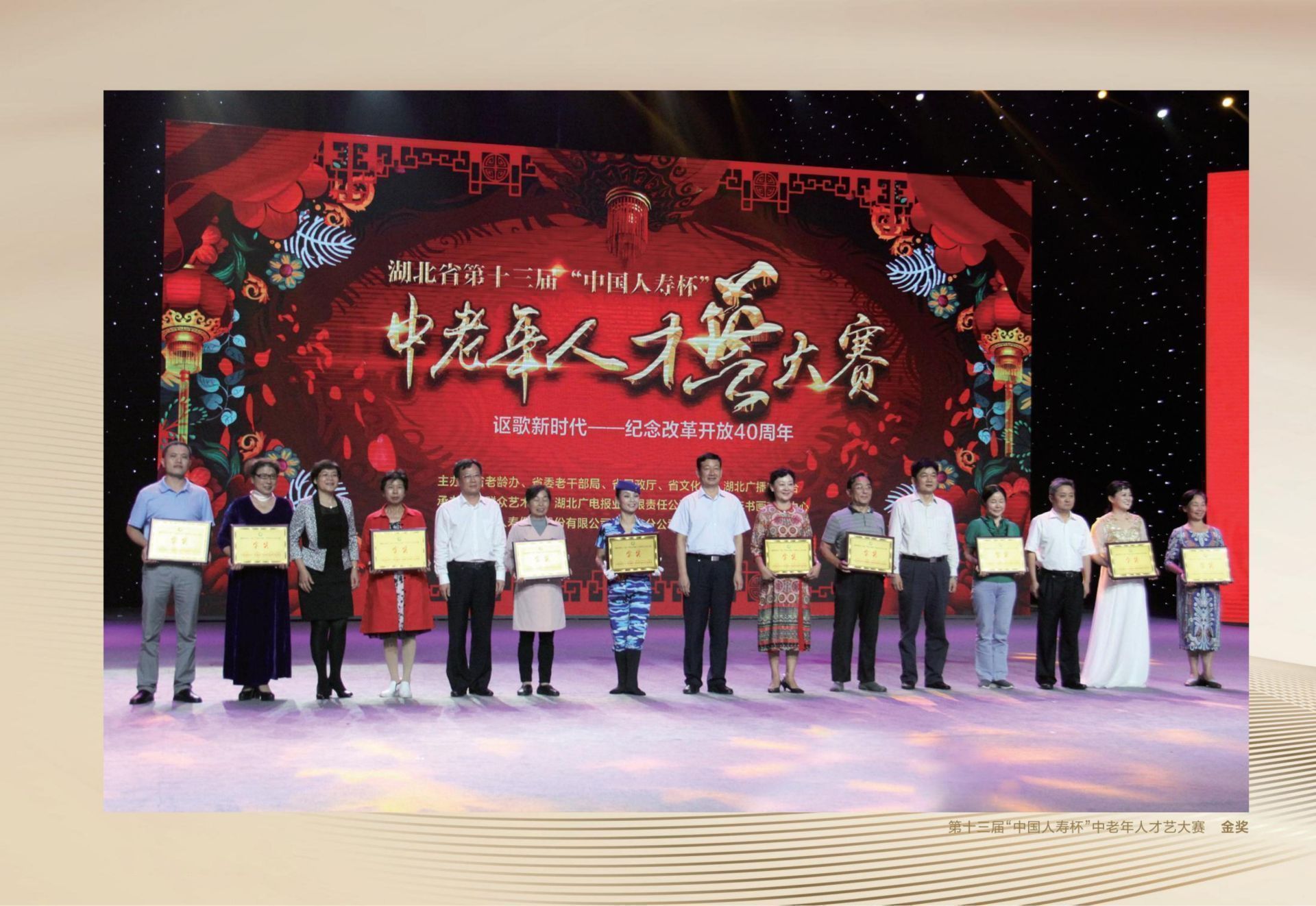 2018年9月27日,湖北省第十三届“中国人寿杯”中老年人才艺大赛(文艺类)决赛、颁奖典礼在湖北广播电视台2000平米演播厅隆重举行。本届大赛以“讴歌新时代——纪念改革开放40周年”为主题,得到了广大中老年朋友的积极响应和社会各界的广泛关注,有近30万名中老年人参与各项赛事。在各地初赛的基础上,大赛组委会经过严格评审,遴选出45个节目参加决赛。决赛最终产生了《跟你走》《贝加尔湖畔》《三百六十五里路》《响亮节拍》《映山红画》《明月几时有》《走向深蓝》《儿行千里》《节哟节》《粉墨情思》等10个金奖,以及其他银奖、铜奖等。