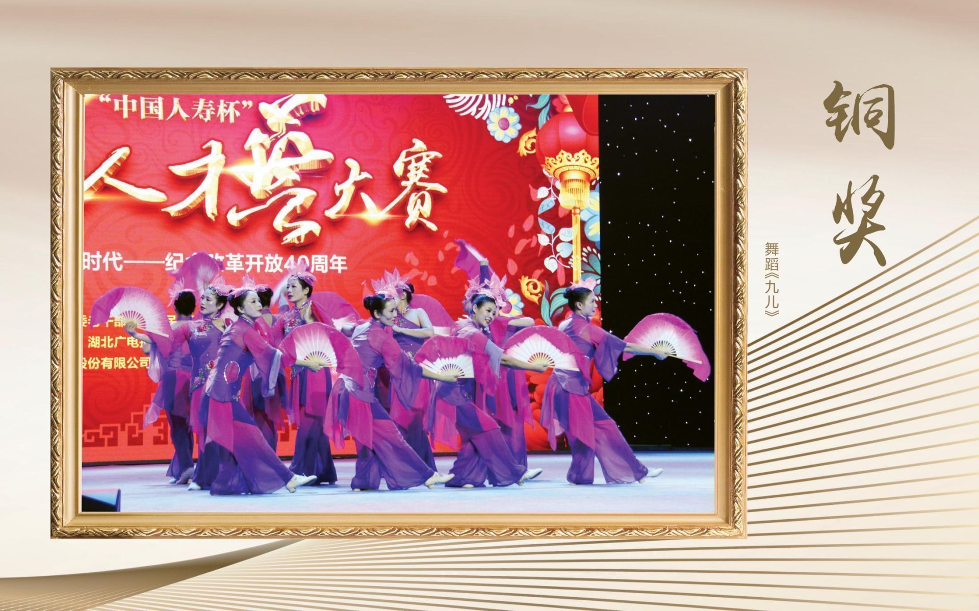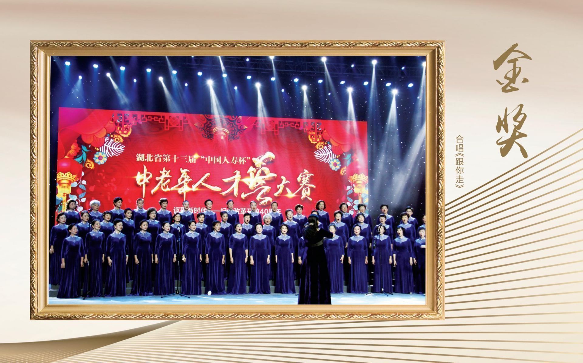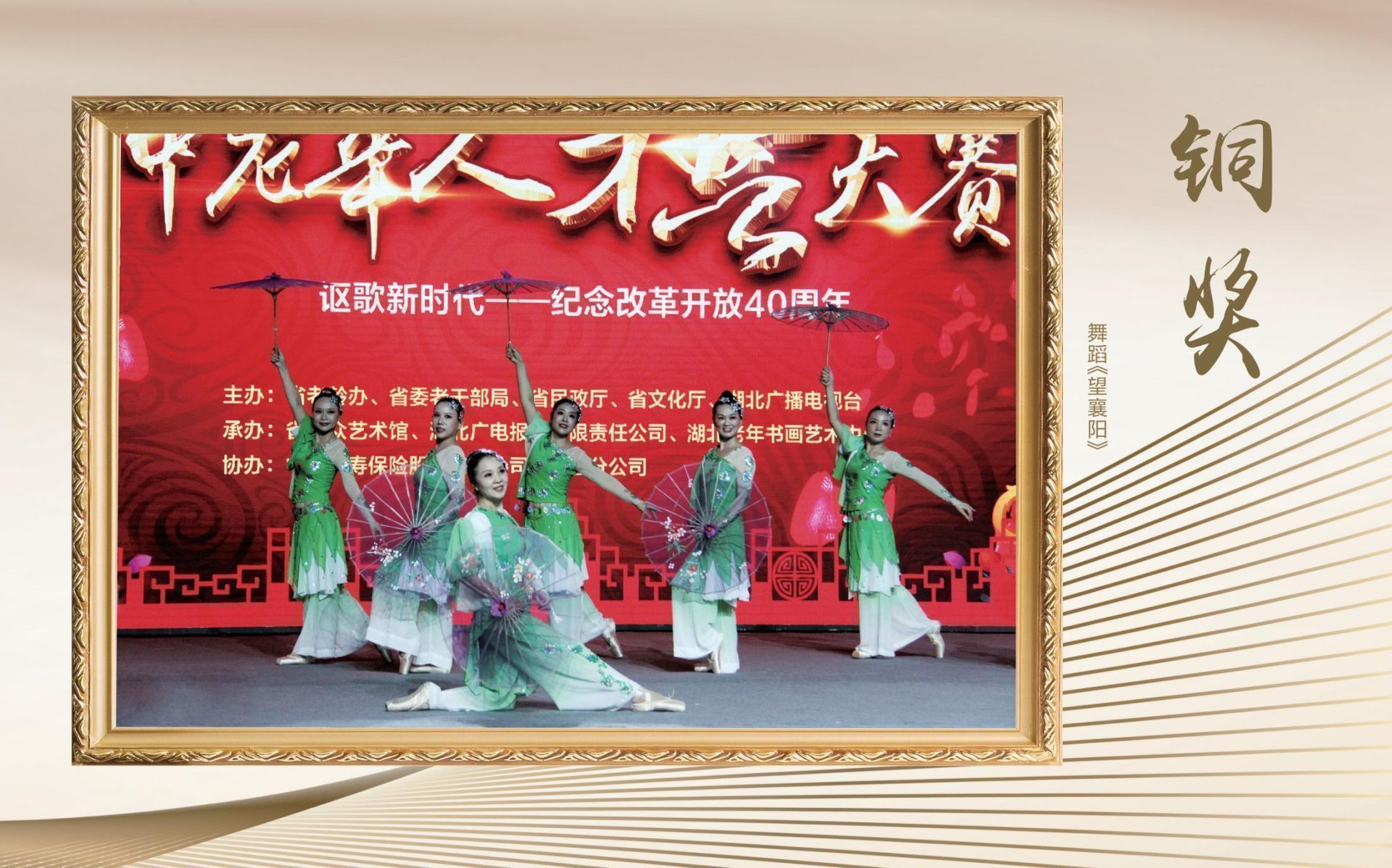 2018年9月27日,湖北省第十三届“中国人寿杯”中老年人才艺大赛(文艺类)决赛、颁奖典礼在湖北广播电视台2000平米演播厅隆重举行。本届大赛以“讴歌新时代——纪念改革开放40周年”为主题,得到了广大中老年朋友的积极响应和社会各界的广泛关注,有近30万名中老年人参与各项赛事。在各地初赛的基础上,大赛组委会经过严格评审,遴选出45个节目参加决赛。决赛最终产生了《跟你走》《贝加尔湖畔》《三百六十五里路》《响亮节拍》《映山红画》《明月几时有》《走向深蓝》《儿行千里》《节哟节》《粉墨情思》等10个金奖,以及其他银奖、铜奖等。
