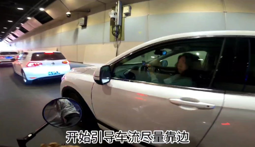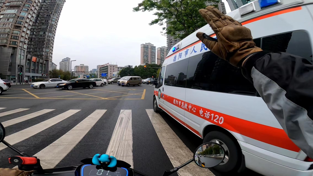 小伙子大约“开道”了1公里道路,见救护车通过拥堵路段后,他停下等红灯,救护车驶过也鸣笛表示感谢。